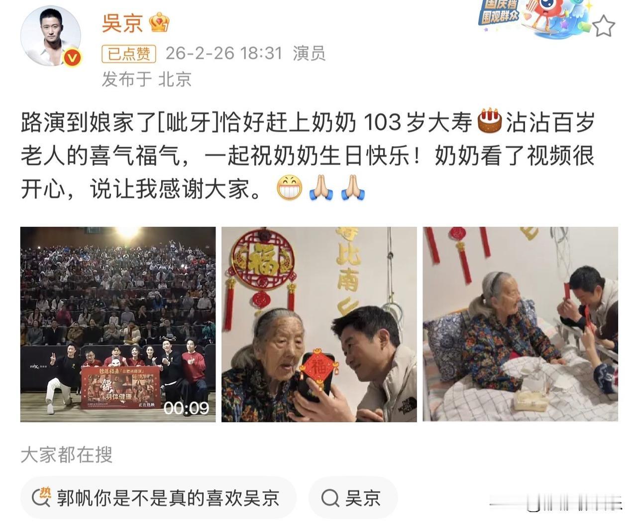 吴京高调发文,我太开心了。 2月26日傍晚,吴京在社交平台高调发文,言语间尽显孝顺和快乐。 他发文说: “路演到娘家了,正好赶上奶奶103岁大寿,沾沾百岁老人的喜气福气,一起祝奶奶生日快乐,奶奶看了视频很开心,说让我感谢大家。” 他还配了一段视频和两张图片。 视频中是他在路演时,在电影院录制的大家一起祝奶奶生日快乐的片段。 第一张照片是吴京拿着手机给奶奶看视频,第二张照片是吴京和谢楠手里拿着红包,给奶奶磕头,这是长辈对晚辈的疼爱,亲情再这一刻具象化了。 这位老人是吴京老婆谢楠的奶奶,103岁了看起来还这么精神,51岁的吴京还能拥有奶奶这样的亲人,真的很幸福。 最近吴京为电影《镖人》一直在进行路演,安徽是吴京必来的地方,因为他是安徽女婿,每次有新电影上映,他都不忘来安徽宣传,因为这里有他的娘家人支持他。 《镖人》这部电影,从大年初四开始口碑反转,票房逐渐上涨,吴京在影片中的打戏,拍案叫绝,确实很值得一看。 吴京票房 镖人