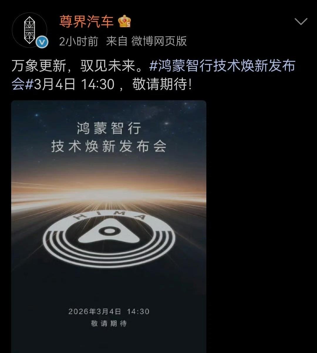 余承东此前就明确说过,今年鸿蒙智行要步入L3/L3+时代,2026年被行业普遍视为L3级自动驾驶落地的关键年份,鸿蒙智行3月4日“技术焕新”发布会,ADS 4.0 Pro是绝对的重头戏。,结合端到端大模型和“WEWA世界模型”,智驾决策将不再只是机械避障,而是更像老司机一样会“博弈”、会“预判”。特别是在高速路段,有望实现真正的“脱手脱眼”,高速通勤解放双手,向L3级的“系统接管”迈出实质性的一步。 那么问题来了,最先搭载ADS 4.0 Pro是尊界S800还是问界M9呢?