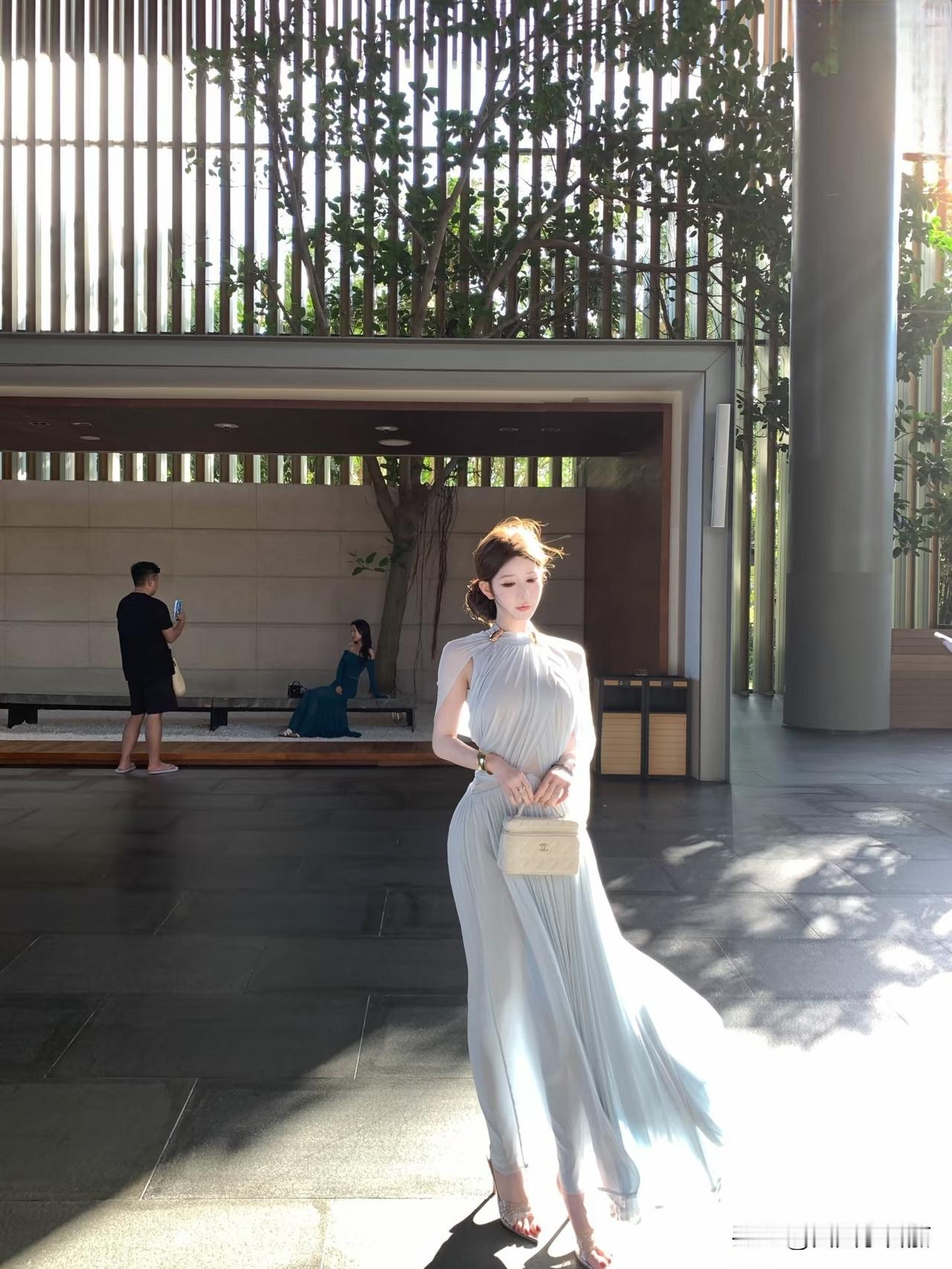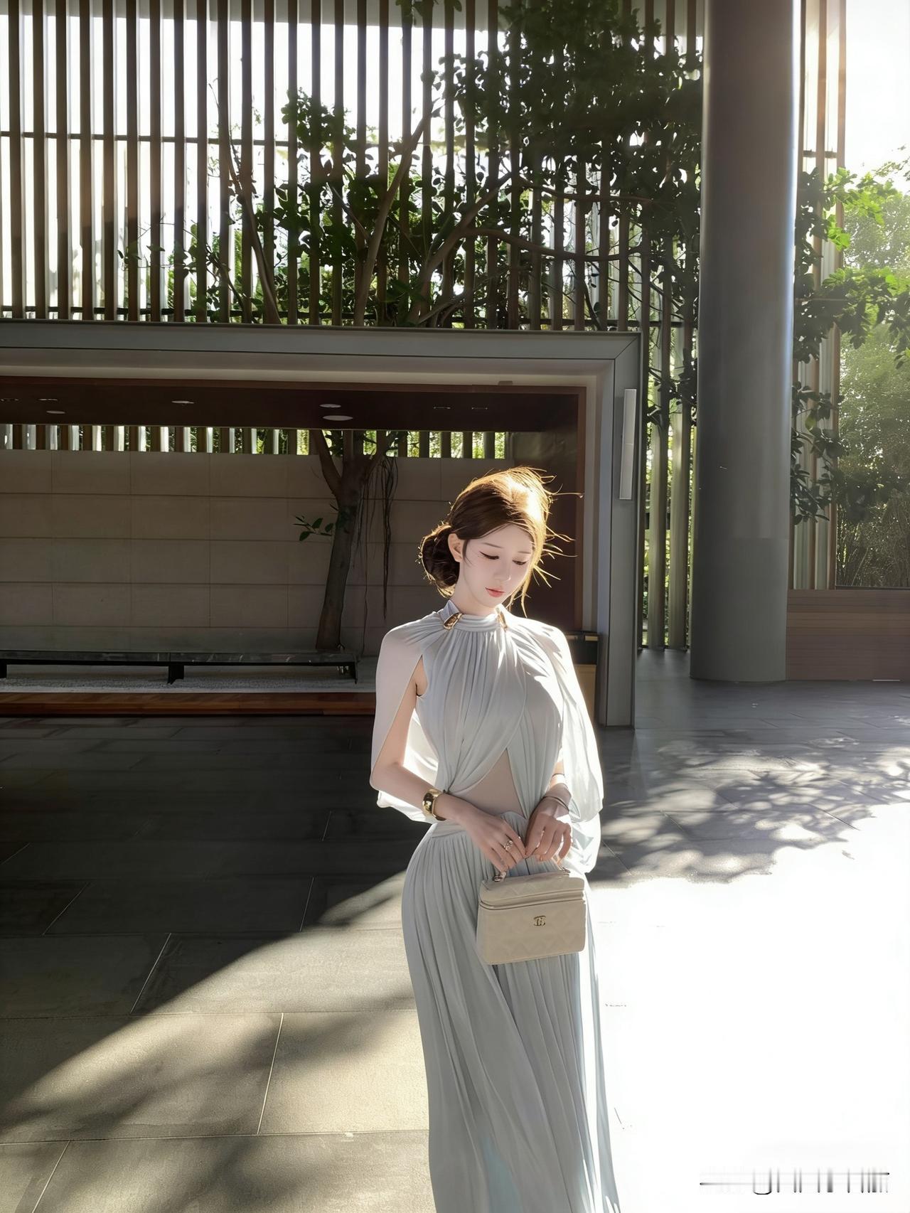 气质女神早春穿搭每日穿搭高级感长发垂落,浅杏色抹胸开叉裙勾勒出利落线条