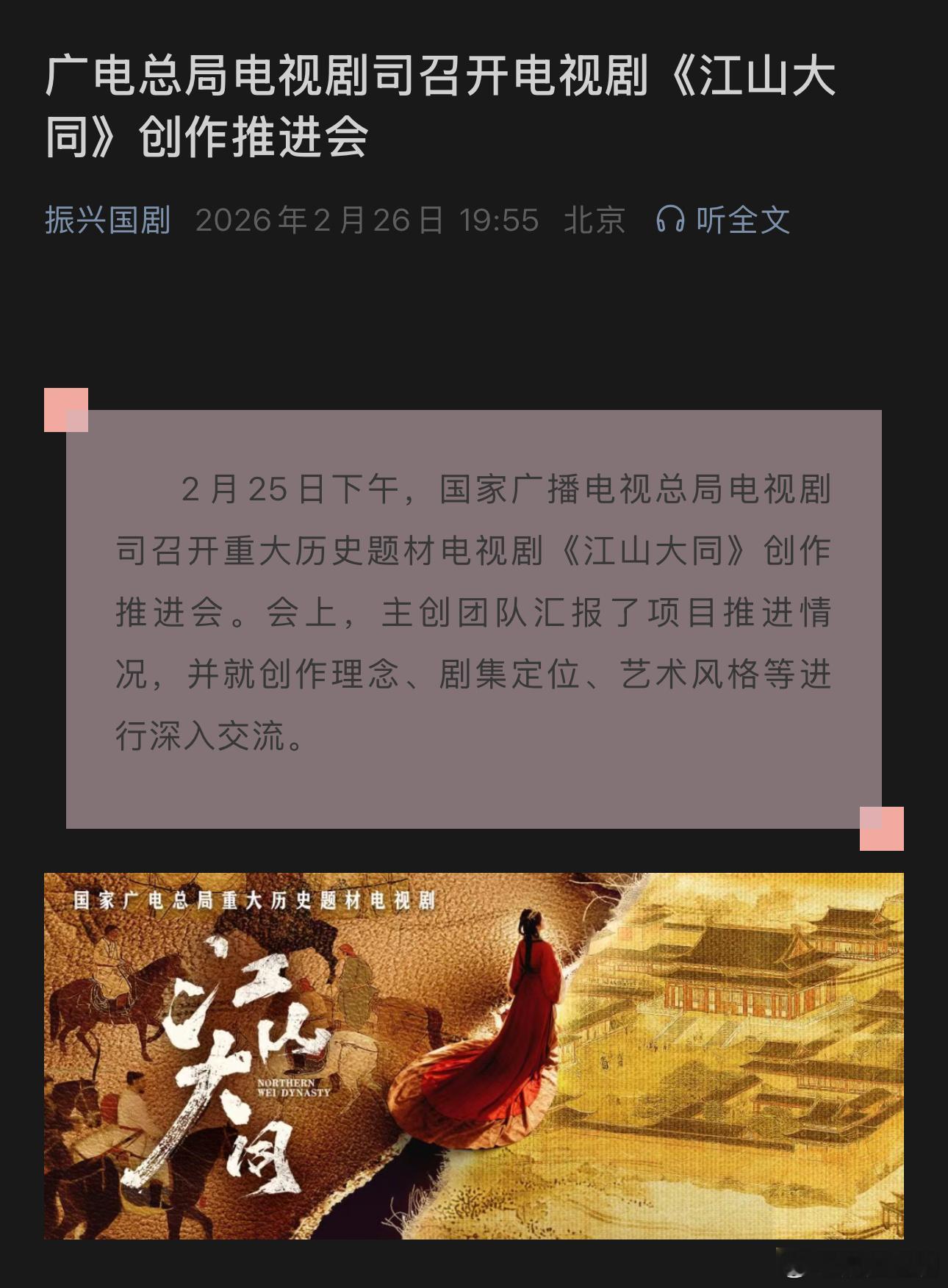 振兴国剧发布:广电总局电视剧司2月25日召开电视剧《江山大同》创作推进会,据悉将于3月中旬开机。网传演员杨幂、胡军、刘学义、林永健等,阵容不知真假静待花开。