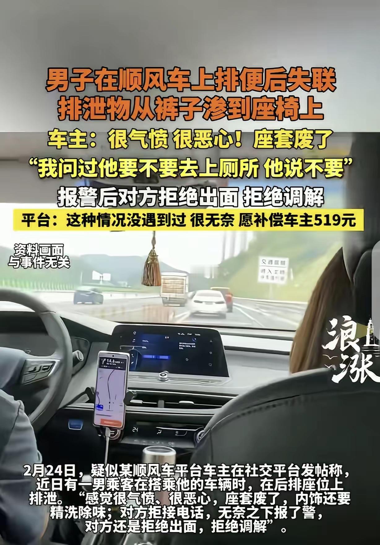这个案例里的乘客行为确实极不负责任,严重缺乏公共道德和诚信意识,令人非常气愤和失望。几点看法如下: 乘客基本素质缺失,影响他人权益 乘客在车内“拉裤兜子”,不仅是对司机个人的极大不尊重,更是公德心严重缺位的表现。顺风车本质上是私人资源的共享和公共资源的辅助,讲究的是相互尊重和信任。乘客没有提前告知自己身体状况,也没有接受司机合理的建议(如去服务区厕所),而是选择了极端不文明做法,导致司机承担清理和维修成本,严重侵犯了司机的合法权益。 司机虽获得平台赔偿,但精神损失难以弥补 平台赔偿了洗车费并更换了座套,算是对经济损失的部分补偿,但这种经历带来的心理不适、对信任顺风车服务的伤害,远非金钱能解决。顺风车司机作为服务提供者,承担着安全和舒适的义务;乘客也应遵守相应的规范。此事暴露出顺风车在乘客管理和服务规范方面仍有不少提升空间。 法律责任与诚信原则 根据《民法典》和诚信、公序良俗原则,乘客的行为虽未直接构成承运人义务的违约(该条主要保障安全运输),但已经违反了社会基本诚信和公序良俗,应承担清理费用、赔偿损失等民事责任。警方介入后乘客拒不协助,表现出逃避责任的态度,更加加剧了事件的复杂性和矛盾。 顺风车的优势与风险并存,提醒大家理性选择 顺风车作为一种便捷、节约的出行方式,确实带来了便利,但不可避免存在风险,尤其是乘客和司机都可能遇到个别行为异常的对方。司机在选择乘客时应多加注意,明确服务规则和安全底线,避免纠纷。乘客则应自律,遵守公共秩序,尊重服务者。 公共道德和社会治理层面的启示 这种极端不文明现象反映了部分人的公共意识淡薄,也折射出在公共服务环境中,“小事不小”的问题。社会应加强公德宣传和文明教育,提高整体素养。同时,平台应加强对乘客和司机的监管,完善投诉处理机制,提升服务体验和安全保障。 总结来看,这件事是个典型的文明缺失、诚信缺失造成的社会矛盾。人人都应尊重他人劳动、尊重公共空间,出门在外多一份真诚和负责,别让“一点自私”伤害了他人。这不仅是对司机,也是对社会整体文明水平的基本要求。希望此类事件能引起更多人的反思和警醒,推动良好社会风气的形成。不讲诚信人 无素质三观道德