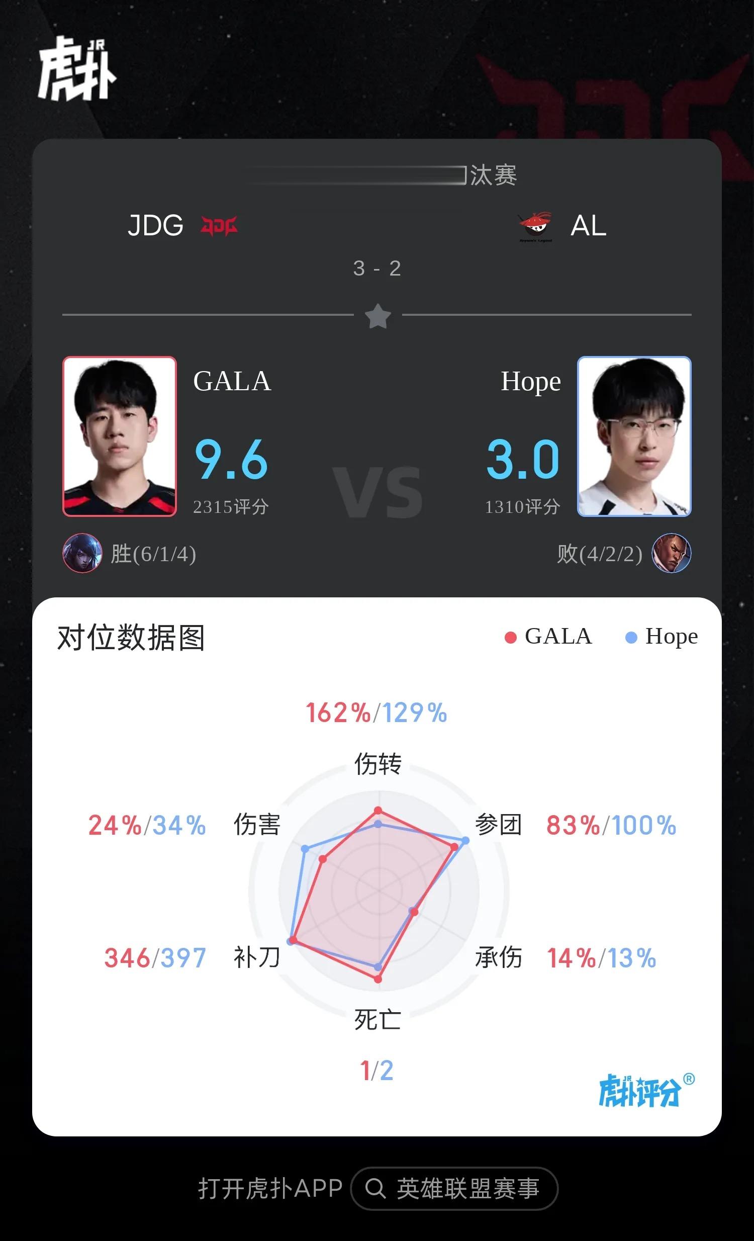虎扑02月26日讯在刚刚结束的JDG对阵AL的BO5比赛中,GALA厄斐琉斯打出6/1/4战绩,斩获JDG对阵AL第五局MVP