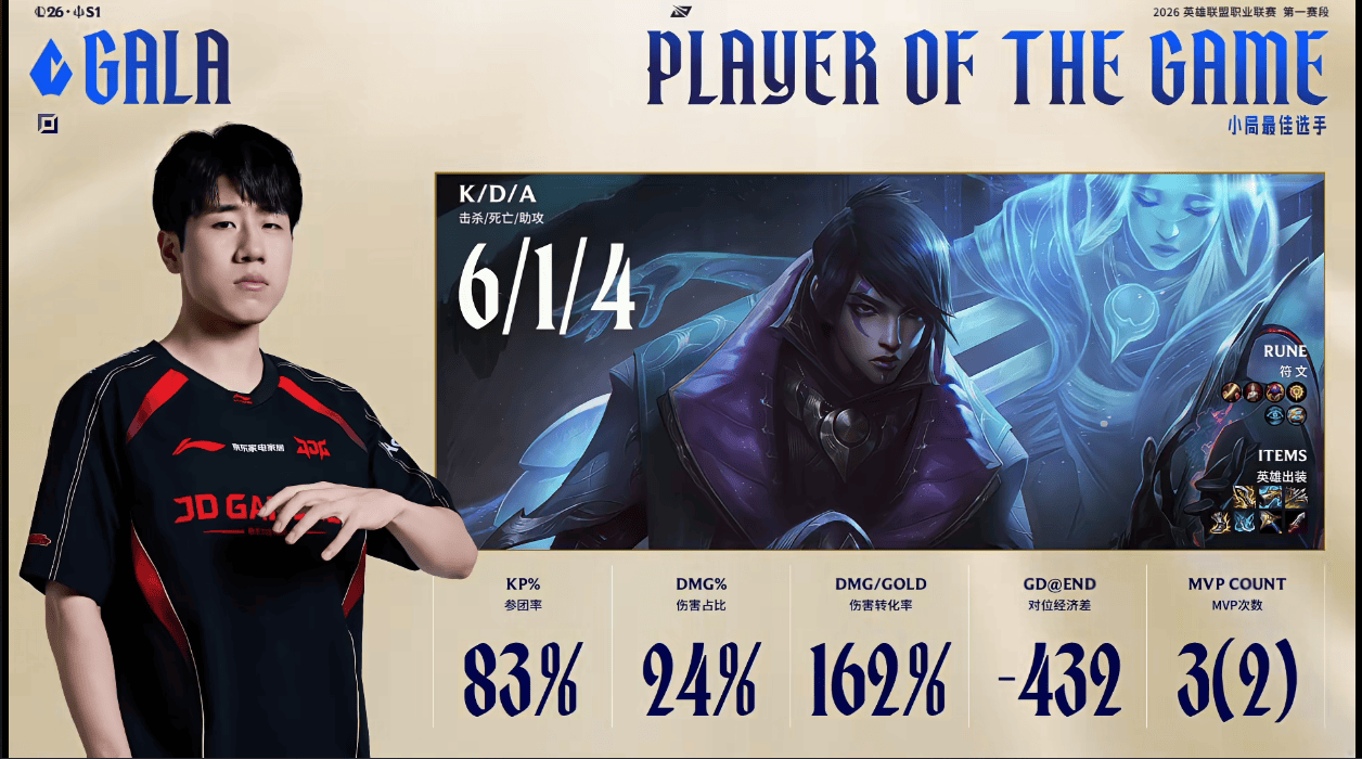 GALA厄斐琉斯打出6/1/4战绩,斩获JDG对阵AL第五局MVP