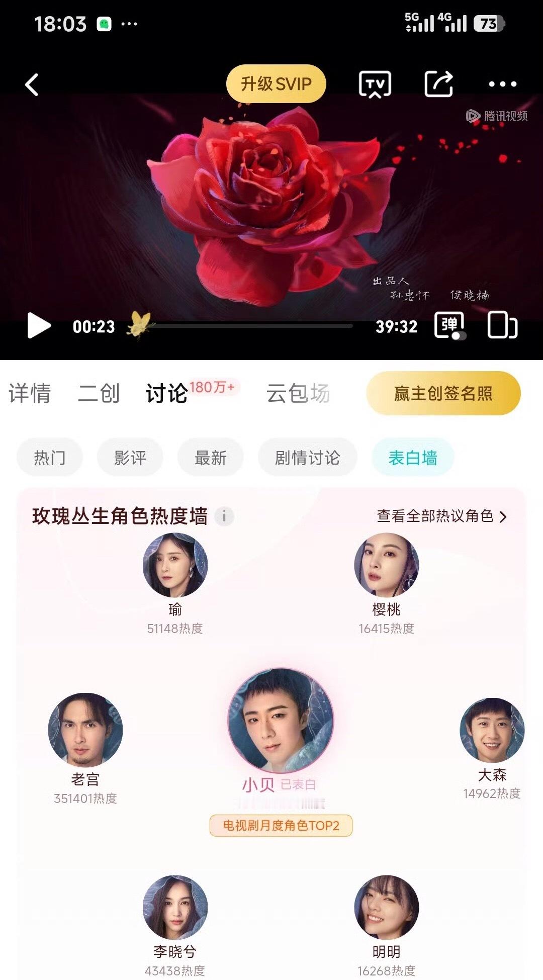 刘宇宁饰演的小贝角色热度3分钟破亿断层第一🎉拿下腾讯视频破亿角色历史最快的好成绩!玫瑰丛生 * 刘宇宁角色热度破亿