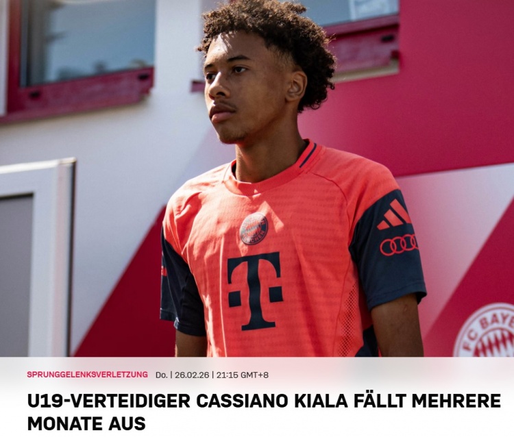 直播吧2月26日讯拜仁官方宣布U19中卫基亚拉(CassianoKiala)脚踝受伤,将缺阵数月。这名17岁小将在代表德国U17国家队参加阿尔加夫杯时受伤,并已成功接受手术。