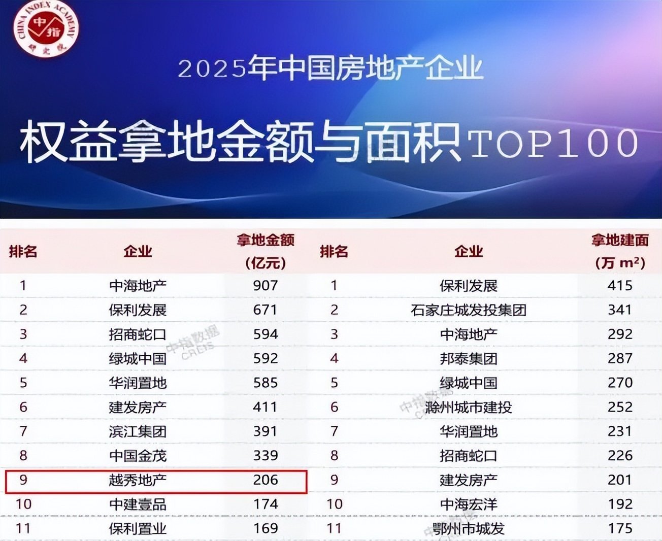 根据中指研究院的数据,2025年,越秀地产的权益拿地金额为206亿元,超过90%集中在北上广深、杭州及成都6个核心城市。
