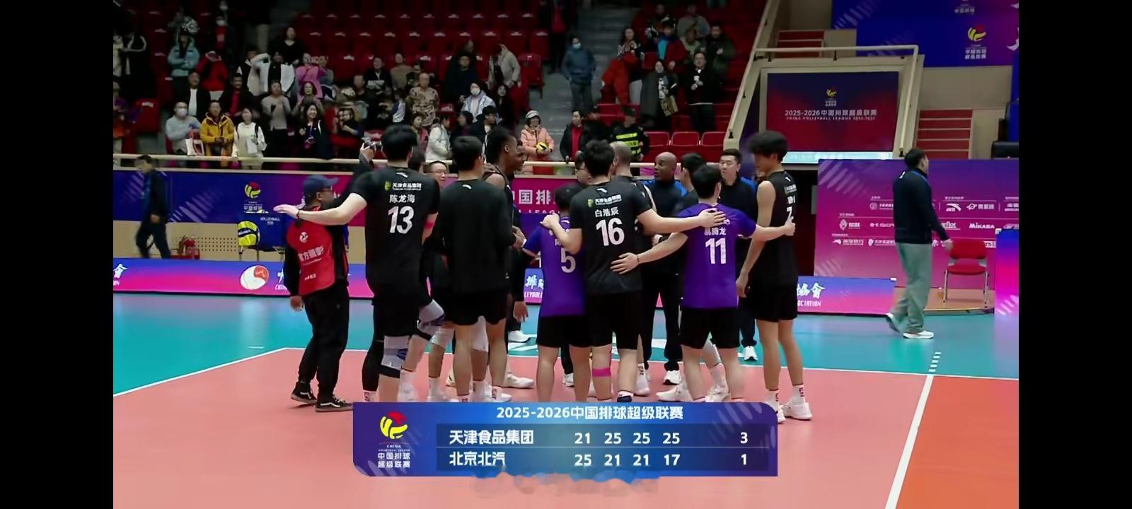 排超联赛 天津男排3比1北京男排,第一局被北京队限制住了两个主要得分点,然后天津换上毛天一,稳住了节奏,北京队这边后面打的有点乱!至此,今天比赛结束,主场球队全部获胜。排球中国男排