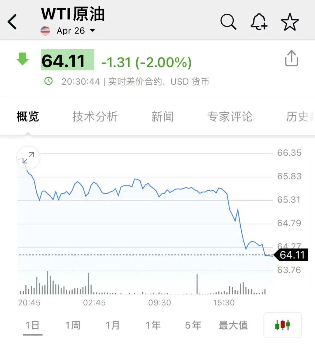 今日,WTI原油期货跌幅扩大至2%,报64.11美元/桶。