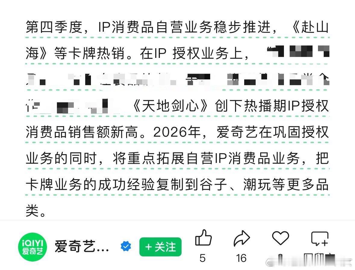 爱奇艺Q4财报收入同环比双增,成毅双剧再创佳绩。Q4财报继续提到第三季度播出的成毅《赴山海》,卡牌持续热销,ip价值为平台带来可持续增长,连登两季度财报。成毅《天地剑心》创下热播期IP授权消费品销售额新高。ee不愧是行走的ip,真财神爷