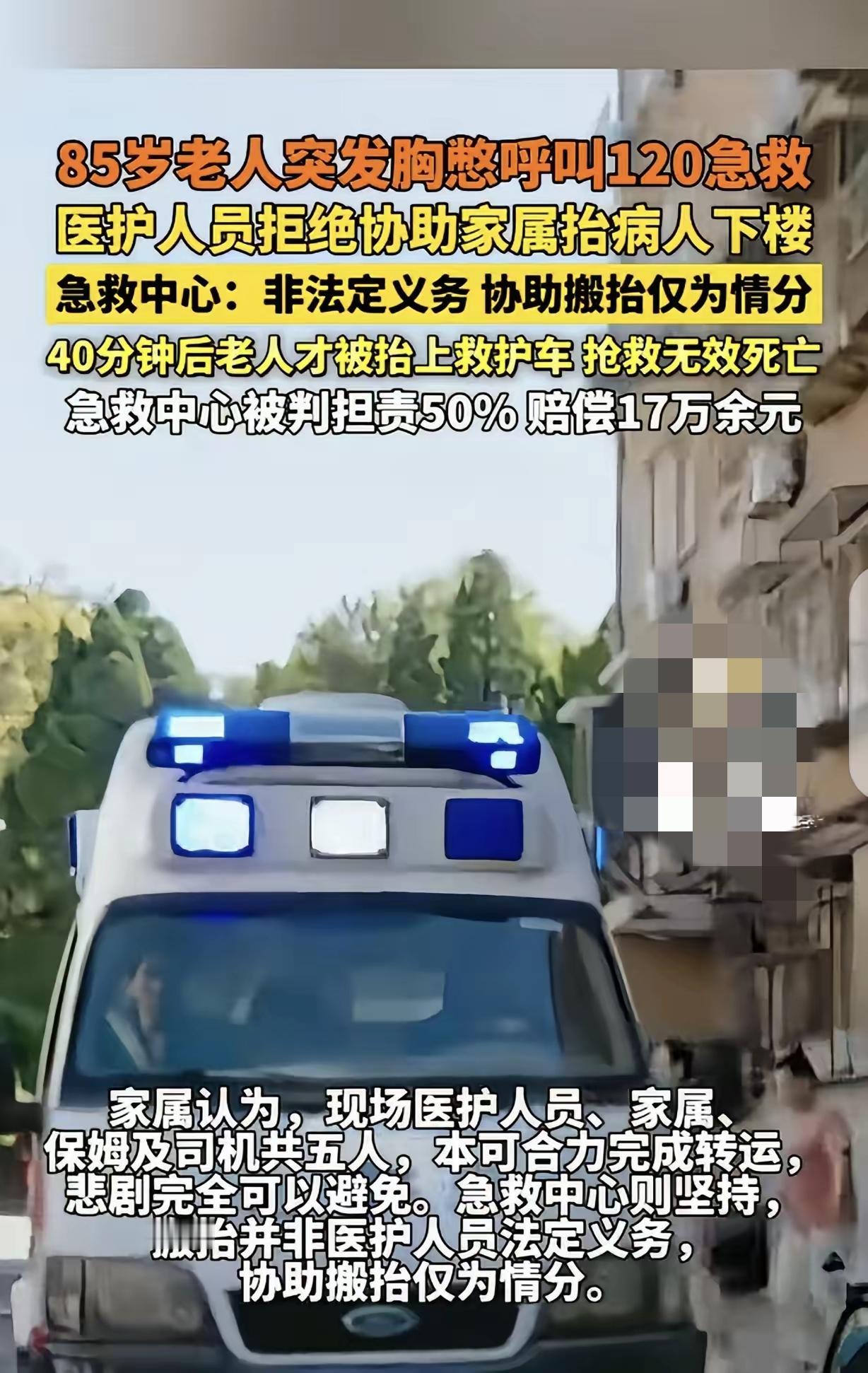 120拒抬老人离世,二审维持17万赔偿!搬抬是情分还是本分? 山西阳泉,一85岁老人发病,虽然离医院就4分钟的路,但家人怕耽误病情还是叫了120。不料医护人员拒绝帮家属把老人抬下5楼,导致老人40分钟才上救护车,因耽误抢救不幸离世。而急救中心却说:我们没义务帮着抬人,帮是情分,不帮是本分。家属愤怒地起诉到法院,一审:急救中心承担50%责任,赔偿家属17万,急救中心上诉,二审判决出乎意料。 这起引发全网关注的事件,发生在2024年6月9日深夜,经红星新闻等权威媒体报道,又因2025年11月的二审判决再次刷屏,至今仍是大众热议的民生焦点。事发时老人85岁,患有高血压、冠心病等基础病,身体虚弱,当天突发胸闷憋气,情况十分危急。老人住在无电梯的老旧居民楼5楼,家人明知医院很近,也不敢随意挪动,第一时间拨打120,就是指望专业人员安全转运,抓住黄金抢救时间。 让家属绝望的是,120医护赶到后,明知老人无法自主行动,也清楚5楼步梯转运难度大,却直接拒绝协助抬人。家属当场反复恳求,只希望医护搭把手把老人抬下楼,愿意事后表示感谢,可对方始终坚持没有抬人的义务,在楼下等待不肯出手。 从急救人员抵达,到家属找人帮忙、最终把老人抬上救护车,整整耽误了40分钟。对急症老人来说,这40分钟就是救命的关键,短短几十米的楼梯,成了生与死的分界线。 老人被送上救护车后,急救过程也存在明显疏漏,未按规范开放气道、及时使用急救药物,胸外按压操作不达标,多重失误叠加,老人最终没能抢救回来,永远离开了家人。 家属无法接受这个结果,更不认同急救中心“帮是情分,不帮是本分”的说法。120院前急救的核心就是抢时间、保生命,面对高龄、无法移动的患者,协助安全转运,本就是急救服务的应有之义,不是可做可不做的人情。 家属将急救中心告上法庭,司法鉴定明确:急救中心存在未及时监护用药、延误转运、心肺复苏不规范三项过错,与老人死亡存在直接因果关系。一审法院判决,急救中心未尽合理救助义务,承担50%责任,赔偿17万余元。 急救中心不服,以“搬抬非法定义务”上诉,二审法院审理后直接驳回上诉,维持原判。法院用判决划清责任边界,明确否定“抬人是情分”的说法,院前急救不能只走流程,必须守住生命至上的底线。 这起案件给所有急救机构提了醒,老旧小区无电梯、患者行动不便,是最常见的急救场景,配齐人员、做好转运准备,是120的基本要求。拿“没有义务”当借口,在生命面前推诿懈怠,既违背职业初心,也要承担法律责任。 120的意义,就是在人们最无助的时候伸出援手,这是职责所在,不是情分与本分的选择。法律已经给出公正答案,生命安全,永远排在第一位。 各位读者你们怎么看?欢迎在评论区讨论。