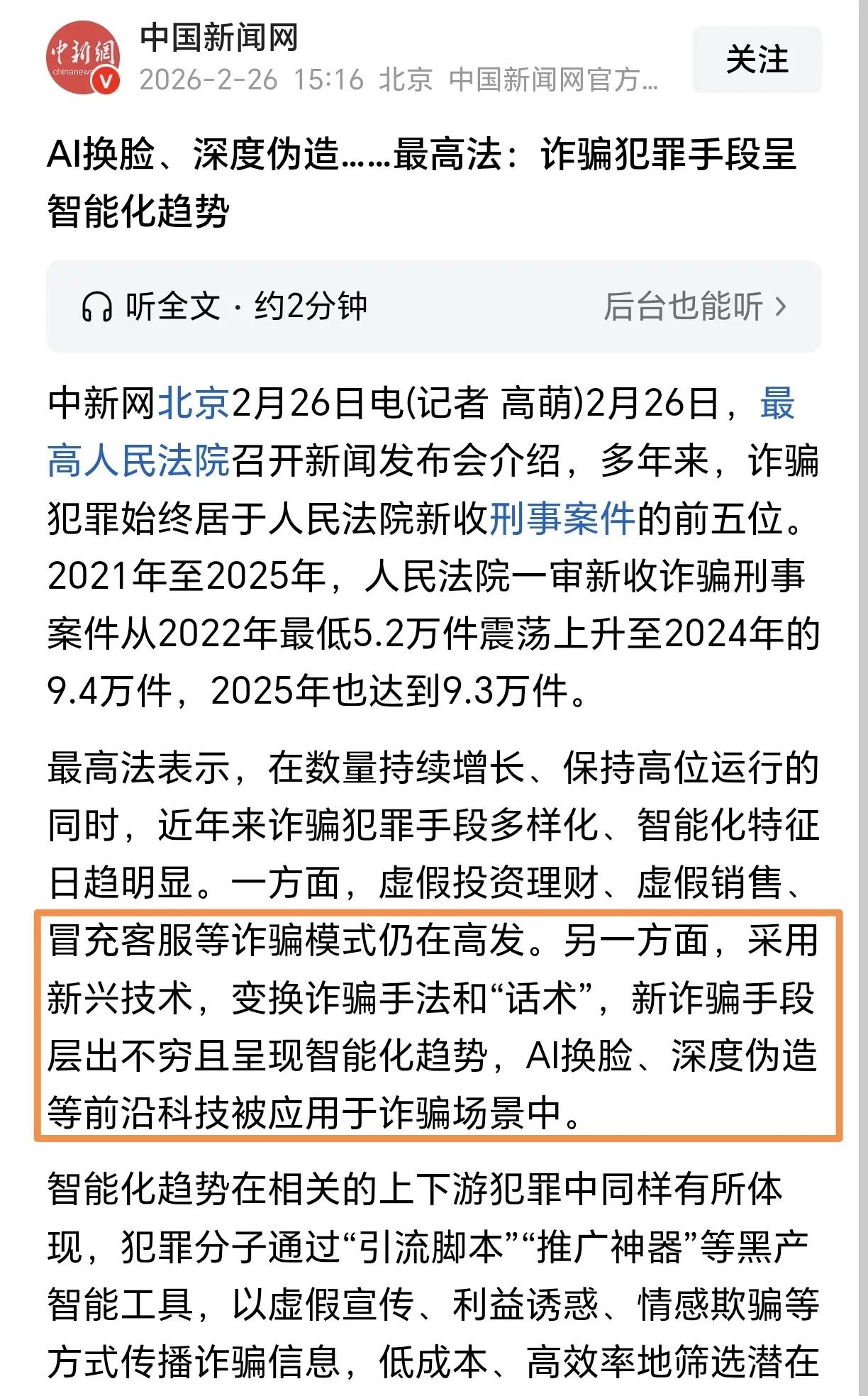 最高法新发布了电诈犯罪典型案例。 一个是逃到境外后、重操旧业组织网络电诈窝点继续行骗的余某波,到案后退赔财物、但因造成3亿损失,顶格处罚无期徒刑。 一个是利用AI技术拟声孙子诈骗老人的吴某涛,被判处两年一个月、并处罚金。 一方面是ai换脸、深度伪造等智能化技术被用到诈骗中,诈骗手段层出不穷;另一方面是法律对落网电诈犯罪主要分子的处罚并不严厉,电诈造成数亿损失的顶格处罚也就是无期、一般的只有两三年和罚金。 电诈犯罪活动来钱快、易暴利的特点,加上没有死刑威慑的法律条款,注定未来会有更多做着一夜暴富美梦的不法分子铤而走险继续从事电诈犯罪活动。 跨国电诈团伙 电诈现象 境外电诈窝点 境外电诈窝点 跨国打击电诈 反诈电诈 电信诈骗罪 铲除电诈