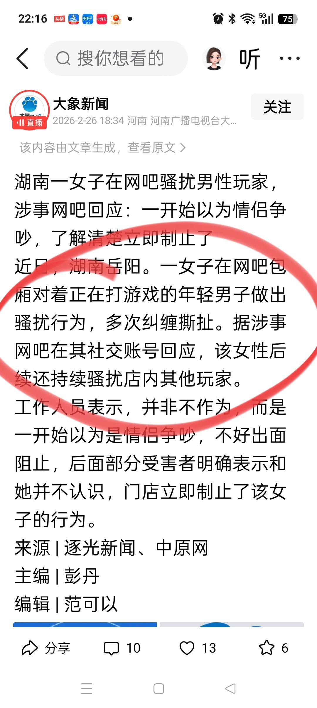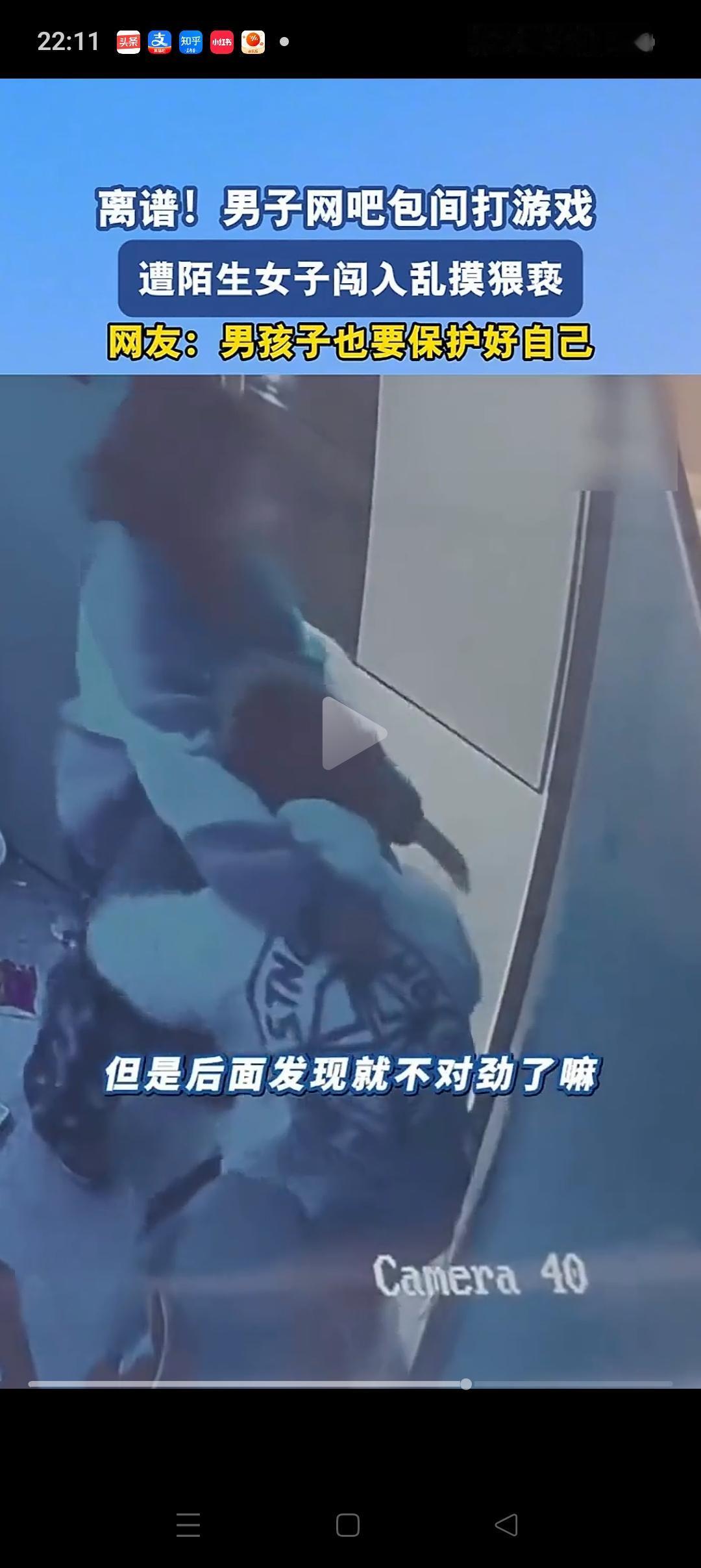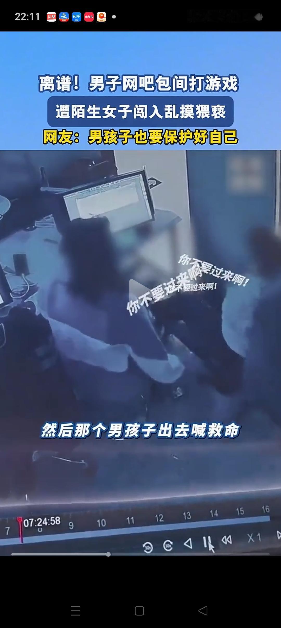 “男孩子出门在外,也要保护好自己”[泪奔],湖南岳阳,一男子正在包间里打游戏。不料一名年轻女孩进来二话不说,直接把裤子脱了一半。还搬来一把椅子,直接坐在了男孩身边,并动手动脚。 男孩一再反抗,想要逃离房间,都被她拽住了。期间虽然很多人围观,但因为不知道他俩的关系,只是在一旁看着。 但随着时间的推移,大家发现他们并不认识。便帮男孩拉开了女孩,让他离开了。 哪知道这名女子并没有立刻离开,反而把目光投向了店里其他玩游戏的男生,让现场很多男生都很尴尬。 虽然不知道这名女孩为什么会这么做。但我觉得网吧应该告知帽子叔叔,如果男生这么做会受到什么样的处罚,女生也不例外,应该接受同等的处罚。 大家觉得呢?