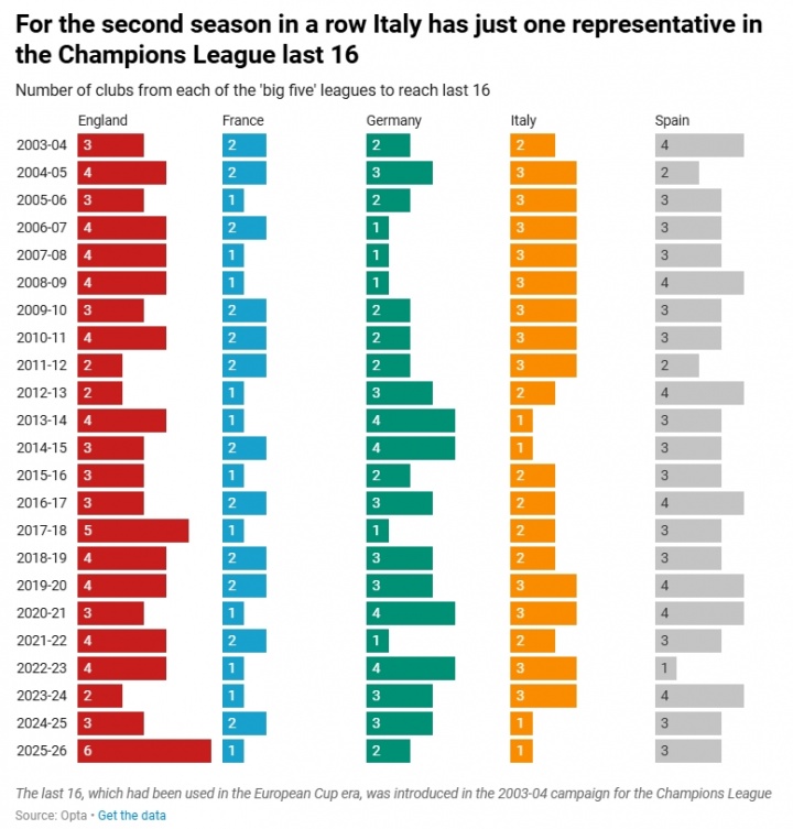 直播吧02月26日讯TA统计了自03/04赛季以来五大联赛晋级欧冠16强的球队数量。其中,近2个赛季均仅1支意甲球队晋级16强。
