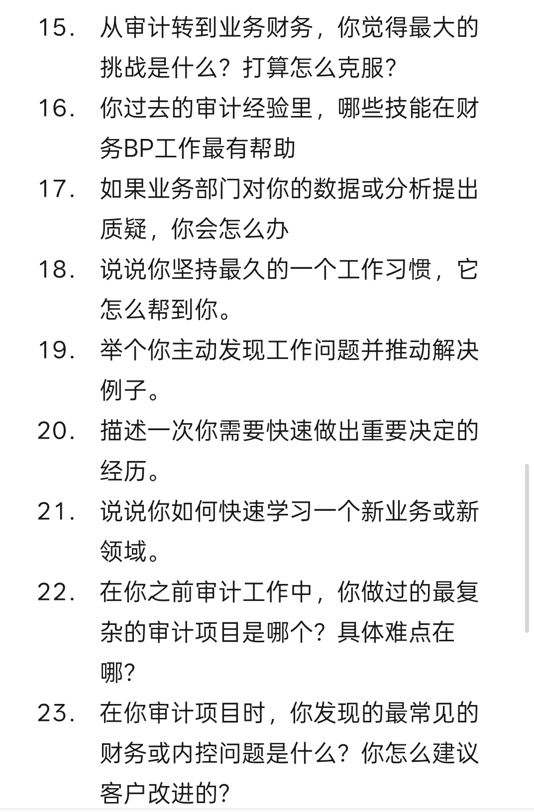 15. 从审计转到业务财务,你觉得最大的挑战是什么?打算怎么克服?