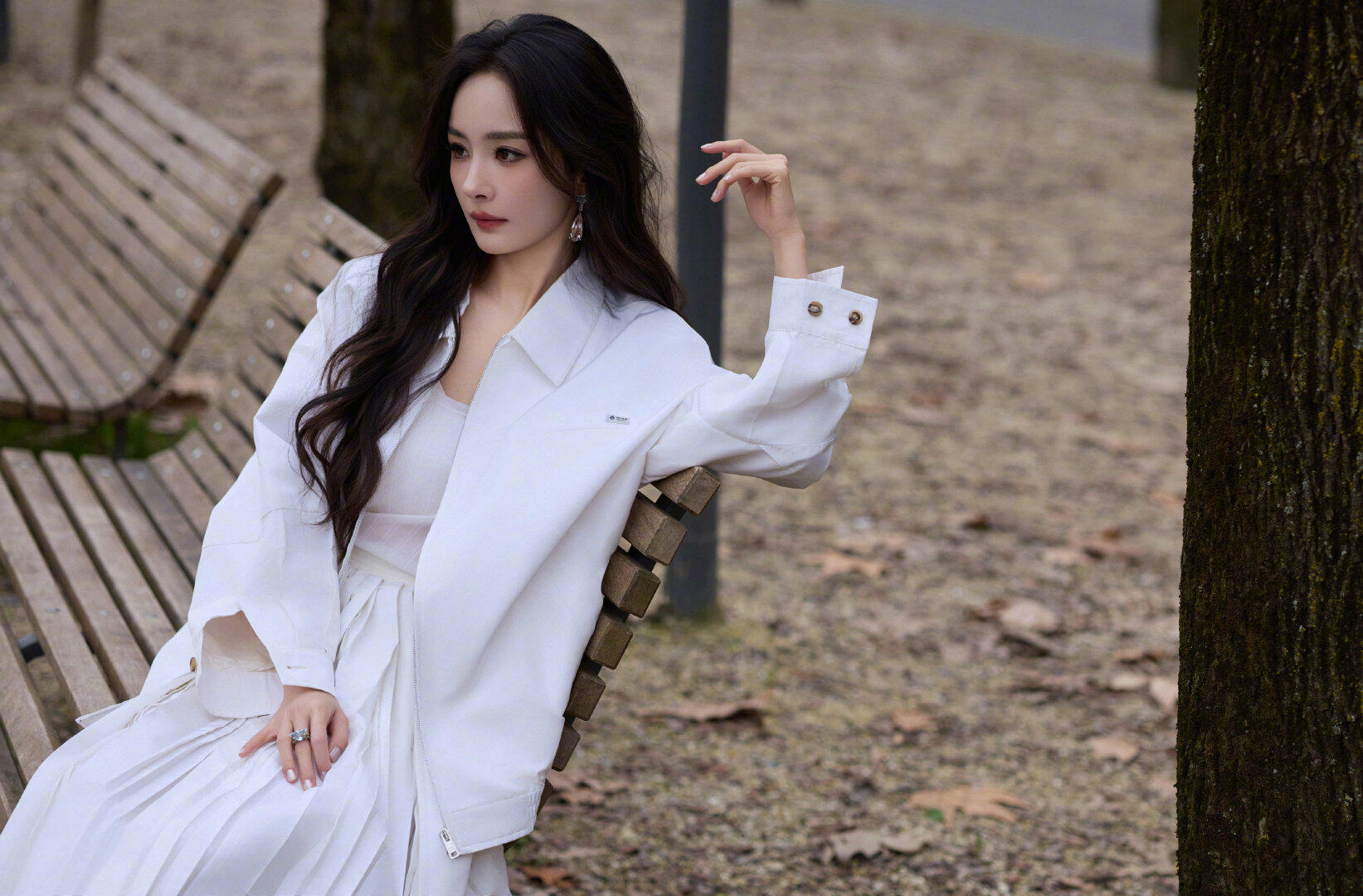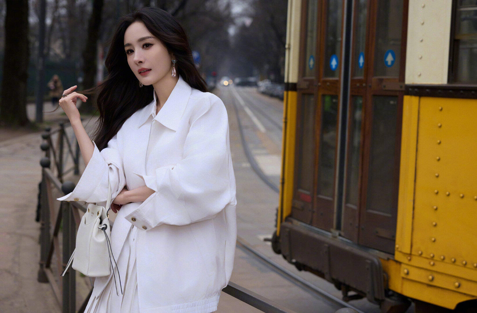 杨幂穿着品牌未发布的Days of Summer 2026白色真丝套装,搭配Prada Carry手袋与精品珠宝,清冷贵气,品牌排面直接拉满。