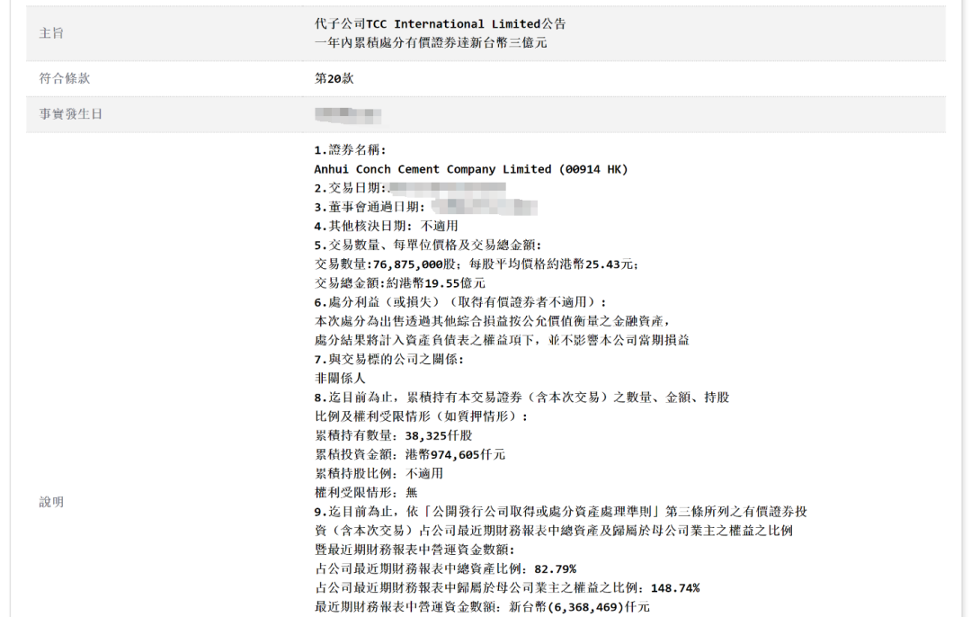 2月25日,台泥公告,子公司TCCInternationalLimited出售海螺水泥7687.5万股,每股均价约25.43港元,交易总金额约19.55亿港元(约人民币17.09亿元)。