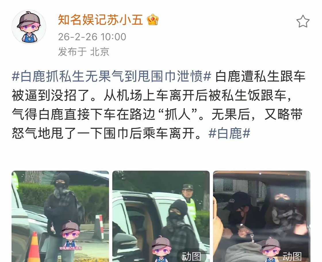2月26日,白鹿抓私生无果气到甩围巾泄愤,本来准备下车跟私生理论一番的白鹿,在看