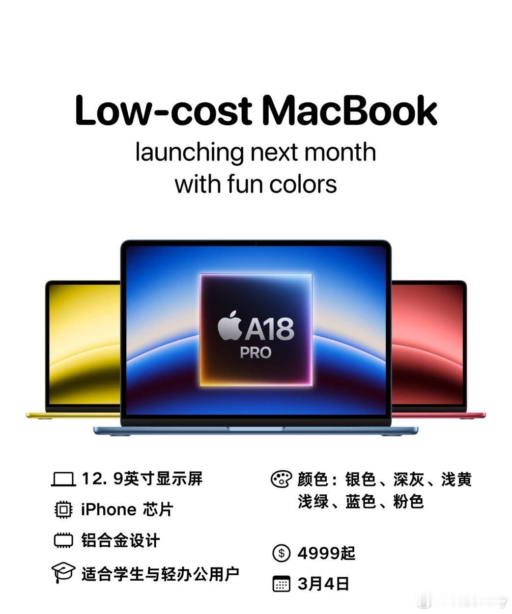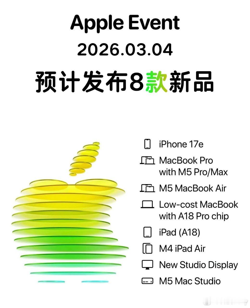 苹果已确认2026年3月4日北京时间晚上十点举办名为“Apple Experience”的特别活动。苹果新品来了 此次发布会预计在纽约、伦敦和上海三地同步举行,重点将围绕 iPhone 17e、全新入门级 MacBook 以及 M5 芯片系列电脑展开。🗳️以下是目前市场预测最扎实的新品名单:☑️iPhone 17e:作为 iPhone 16e 的配置升级版,升级包括 A19 芯片、MagSafe 以及苹果自研的 C1X 和 N1 无线芯片。采用灵动岛,18MP 前置与单摄优化,传感器由 5 片镜片升级至 6 片,极大地提升视频通话和自拍的画质。并可能通过加入 120Hz 高刷,成为苹果历史上性价比蕞高的入门机型。💻电脑类☑️ 全新的“平价 MacBook”:搭载 A18 Pro 芯片,配备 12.9 英寸显示屏,并提供多种亮丽配色,主打教育市场和轻办公。☑️MacBook Pro:搭载 M5 Pro 和 M5 Max 芯片的 14 英寸及 16 英寸 MacBook Pro,并支持 PCIe 5.0 以实现更快的SSD速度。☑️M5 MacBook Air:13 英寸和 15 英寸机型同步更新至 M5 芯片,外观设计基本保持不变。📟iPad类☑️iPad Air :芯片从 M4 升级至 M5。☑️入门级 iPad (第 12 代):升级至 A18 芯片,其核心目的同样是为了让最便宜的 iPad 也能跑得动 Apple Intelligence。🖥️预计还包括显示器和主机:☑️Mac Studio:芯片升级至 M5 Max 和 M5 Ultra。☑️Studio Display:27 英寸屏幕,采用 mini-LED 背光,刷新率最高可达 90Hz 或 120Hz,支持 HDR,搭载 A19 或 A19 Pro 芯片。苹果新品来了