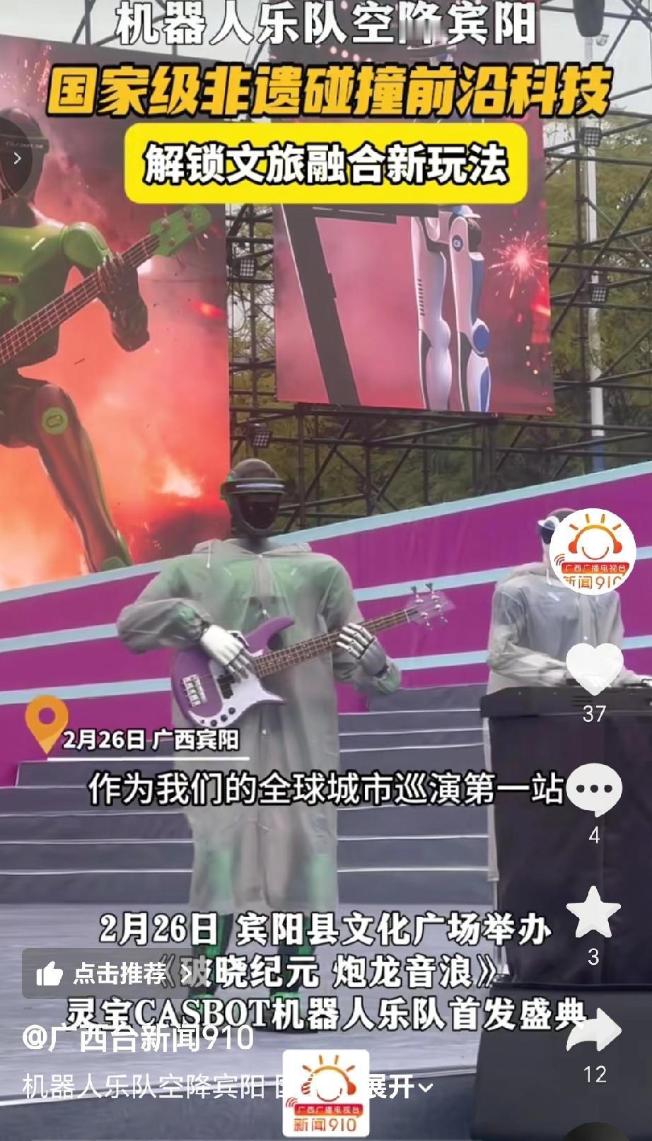 机器人乐队空降宾阳、国家级非遗宾阳炮龙节与前沿科技碰撞,2026年宾阳炮龙节以“AI引潮 龙马精神”为主题,推出立德文娱具身机器人乐队全球首发表演,机器人以机械臂演奏音乐,成为非遗与科技融合的亮点 , 除机器人乐队外,本次炮龙节还打造了AI机械臂舞炮龙、智能机器狗互动、AI仿生机器人写春联等科技场景,与宾阳炮龙这一国家级非遗深度融合 。(来源于@广西台新闻910)