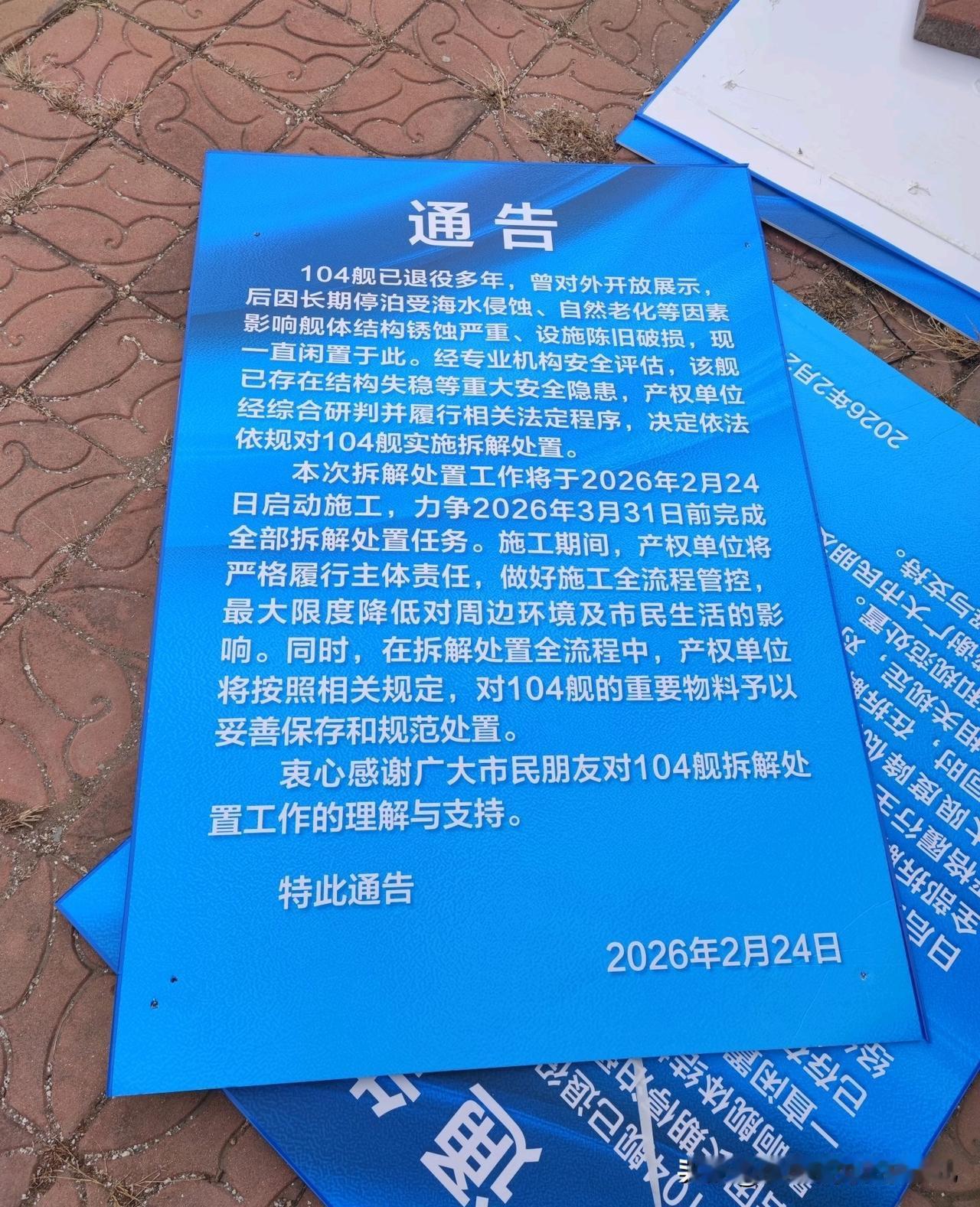 大连104太原舰正式拆解,初代四大金刚再失一员 2026年2月24日,停泊大连老虎滩三十余年的104太原舰正式启动拆解,这是新中国海军初代“四大金刚”又一次告别。通告显示,因长期海水侵蚀、自然老化,舰体锈蚀严重且结构失稳,经专业评估存在重大安全隐患,拆解力争3月31日前完成,重要物料将妥善保存处置。 作为6607型驱逐舰,104舰1955年入列北海舰队,服役36载战功赫赫,曾多次驱离外舰、捍卫领海主权,1970年完成导弹化改装,从火炮驱逐舰升级为反舰核心力量。1991年退役后,它化身国防教育基地,成为大连人数十年的集体记忆,如今围挡围起,老舰终迎落幕。 初代四大金刚仅剩101鞍山舰、103长春舰留存,鞍山舰入列海军博物馆获专业保护,长春舰却舰况堪忧。老舰远去,舷号精神永存,104舷号已由新一代055万吨大驱继承,从2000吨老舰到万吨大驱,见证海军从近岸防御到远洋深蓝的跨越。