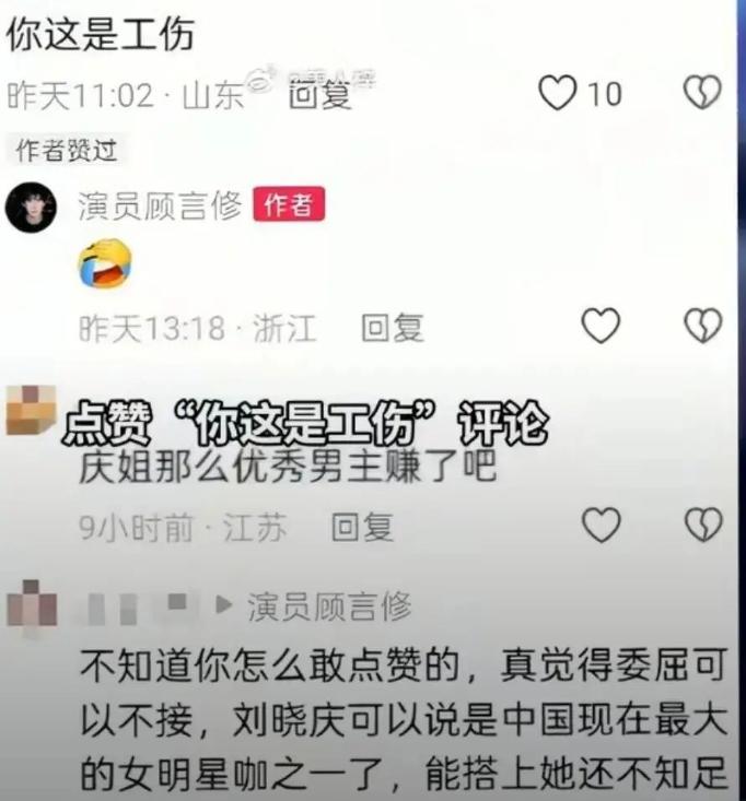 短剧圈子可真够乱的!75的刘晓庆最近出演了18岁的少女,和男主角金珈在剧中上演吻戏,被观众调侃这下金珈算是受工伤了。谁能想到面对调侃,金珈本人没说话,配角出头点赞。 最近刘晓庆主演的短剧《锦绣安然》播出,刘晓庆在剧中饰演18岁的少女,进宫选秀,并被年轻的王爷靖王一眼看中,并要迎娶她当王妃。 而且刘晓庆和靖王的饰演者金珈上演了一段亲密的吻戏,节目播出后马上引起了观众的热议。 要知道,出生于1980年的金珈比刘晓庆小了三十多岁,算是刘晓庆的晚辈了。 有观众评论说,金珈和刘晓庆演吻戏算是受工伤了! 不过让人没想到的是,金珈本人没出头,在剧中饰演配角的演员顾言修竟然点赞了这条评论。 这下网友又不干了,这个顾言修这是瞧不上刘晓庆呢? 这么大牌的老牌明星和他一起拍戏,竟然还遭到了他的嫌弃。顾言修直接被网友给怼上了热搜,他本人也赶紧出来道歉灭火。 现在的编剧和导演为了博眼球真的是什么剧情都敢拍啊!