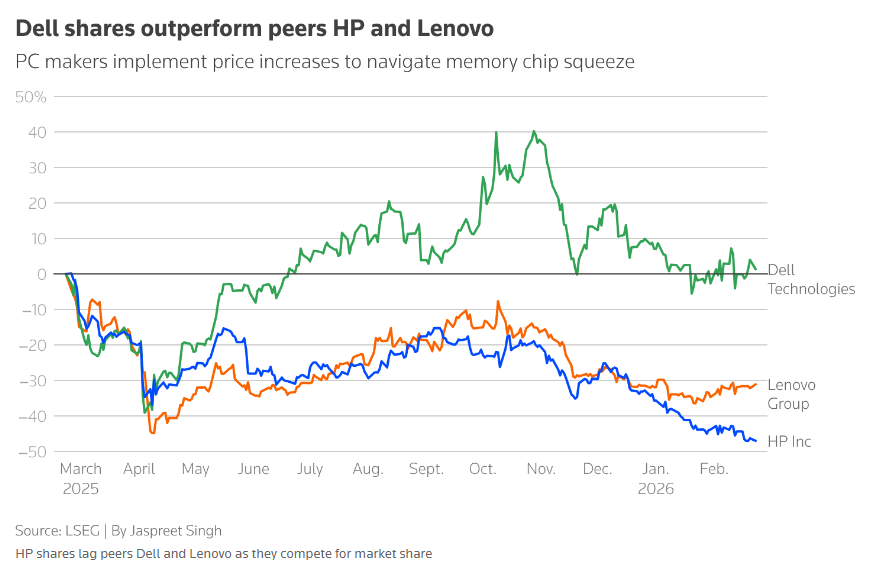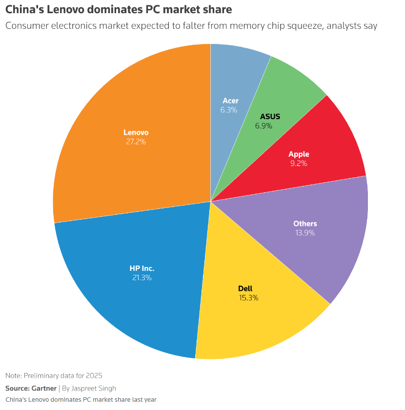此前,惠普表示,其2026财年的业绩预计将处于此前预测区间的下限。联想(00992)也发出警告,称PC出货量面临的压力日益增大。