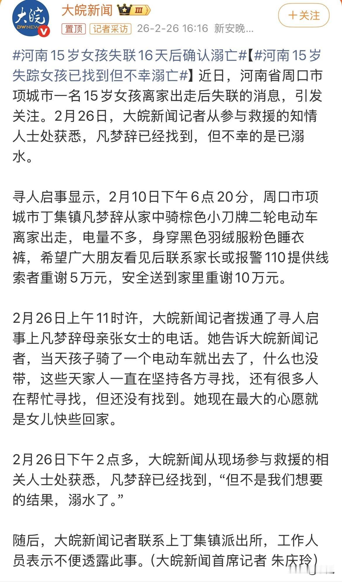 这不是大家想要的结果,16天的等待,最后等来的却是孩子在河里被找到的消息。 2月10号那天晚上,河南项城这个叫凡梦辞的15岁女孩,骑着棕色电动车出了门,身上穿着黑色羽绒服,下面是一条粉色睡裤,脚上甚至只穿着拖鞋。谁家孩子大冬天穿成这样出门?一看就是临时起意,可能就跟家里闹了点别扭,赌气跑出去的。 妈妈张女士那几天急疯了,她平时在外地打工,女儿跟着爷爷奶奶生活。电话里她一直说女儿“性格开朗、乖巧懂事”,学习成绩也好,怎么就想不开要离家出走? 家人一开始悬赏5万找线索,后来有消息说父亲把赏金加到了100万,就为了换女儿平安回家。可妈妈后来澄清,没那回事,赏金一直是5万和10万。其实多少钱都换不来,大人就是想在绝望里抓住最后一根稻草罢了。 救援队沿着河道找了十几天,直到第11天才在河堤边草丛里找到一只拖鞋。妈妈一眼认出来,那就是孩子离家时穿的。那一刻,估计心里已经凉了一半。谷河那段河道三四十米宽,水深五六米,一个穿着睡衣拖鞋的孩子,在黑夜里能往哪走? 最后的消息是,孩子在河道下游12公里处被发现。 知情人说,当天下午女孩跟姐姐吵了一架,监控里能看到她坐在沙发上哭,然后跟姐姐说了几句,推门就走了。谁能想到,姐妹俩拌几句嘴,再见就是永别。 妈妈哭着说,以后再也不会打你骂你了。这句话听得人心里发酸。 现在网上说什么的都有,有的怪姐姐不该吵架,有的说父母不该都出去打工,把孩子扔给老人。说实话,咱不了解别人家的日子怎么过,但有一点是真的——那个穿粉色睡裤出门的女孩,可能只是想出去躲一会儿,却再也没能回家。 您说,这到底是孩子太冲动,还是大人平时忽略了什么?