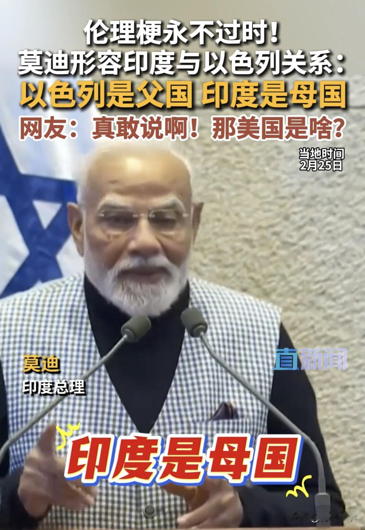莫迪这次访以,是真敢说啊! 这国际政治的辈分,让莫迪一句话全搞乱了!2月25日,莫迪在以色列议会演讲时,抛出了个惊天比喻——把以色列比作“父国”,印度比作“母国”。 这脑洞开得,直接把网友看乐了:按这逻辑,一直被公认是以色列“亲爹”的美国,岂不是瞬间降级成了“儿子”?合着在印度的剧本里,美国成了以色列和印度“生”出来的“娃”? 这波操作,简直是在太岁头上动土——美国辛辛苦苦当了几十年“金主爸爸”,莫迪倒好,直接空降认亲,还要把美国挤到“儿子”的辈分上去,这脸打得啪啪响!