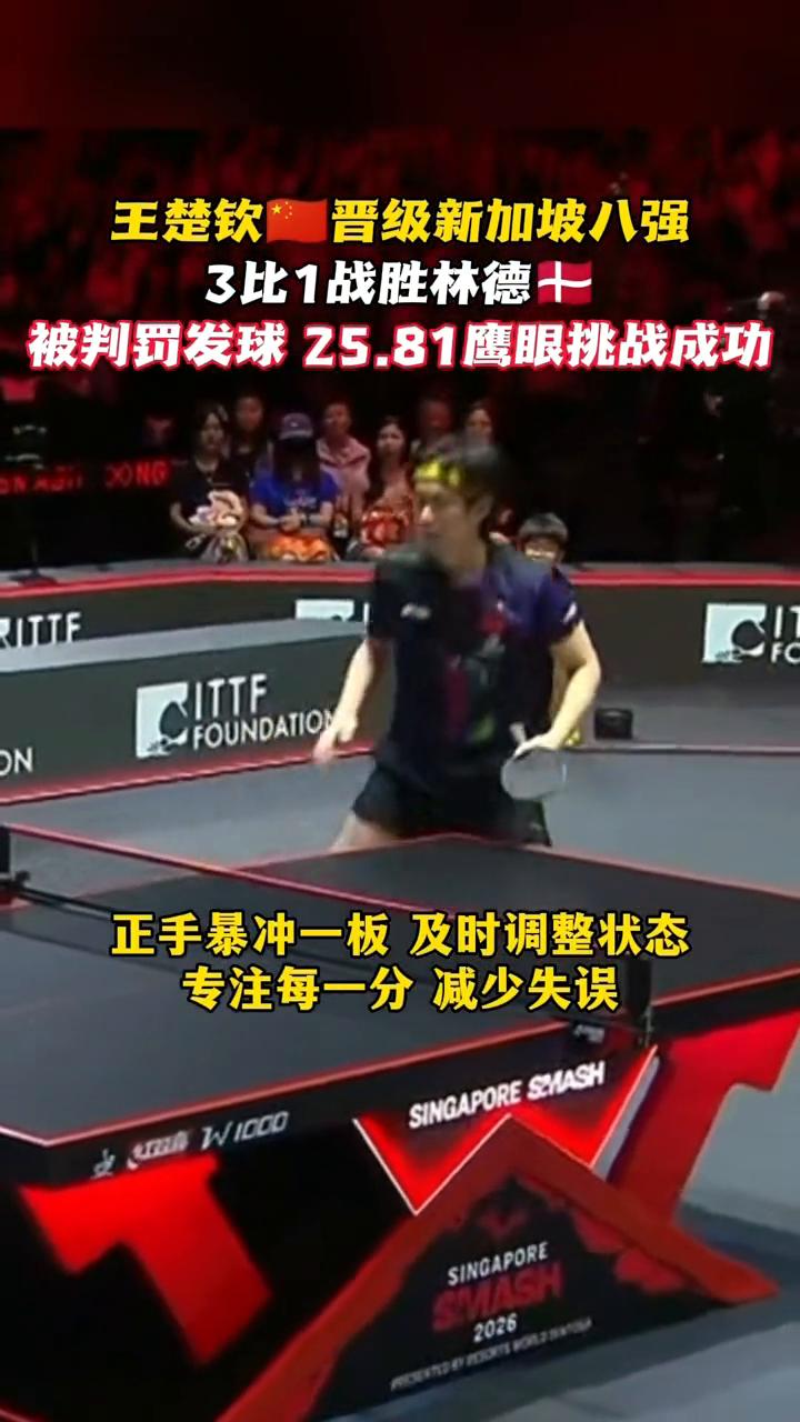 王楚钦晋级新加坡八强,3比1战胜林德十,被判罚发球25.81鹰眼挑战成功。 王楚钦临场解题成功,第三局1比7落后追分13比11拿下,上演惊天大逆转。全程比分非常焦灼,白告教练肉眼可见的紧张了,目光如炬连续鼓掌。正手暴冲一板及时调整状态,专注每一分减少失误。林德远程求助场外教练,不得不说手感球和变化有一定的威胁性,追分超级漂亮,找回自己的节奏!连续得分,超级棒的王楚钦。 被裁判直接判罚发球回抛,25.81度鹰眼挑战成功,没有受判罚的影响积极主动上手,晋级新加坡八强。抬头仰望看台的大头,一场焦灼战你拼尽全力抗住了,祝贺晋级新加坡男单八强。