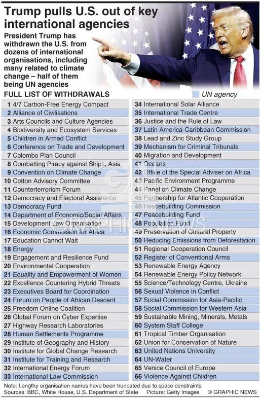 因为,在过去一年里,美国行政当局通过备忘录,宣布退出或暂停了66个国际组织和协议,从世界卫生组织(WHO)到巴黎协定,再到无数个不起眼但维持着全球运转的技术委员会,美国正在进行一场“系统性撤退”。