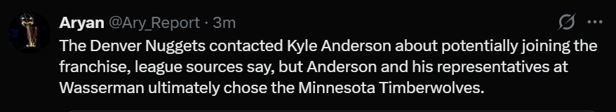 随后,美记Ary发文:据联盟消息人士透露,丹佛掘金队曾就加盟事宜与李凯尔进行接触,但李凯尔及其经纪公司Wasserman最终选择了明尼苏达森林狼队。