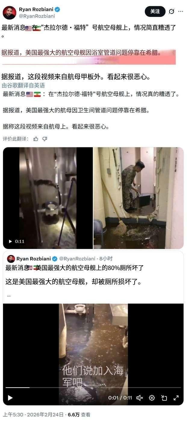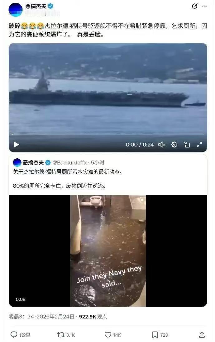 2月26日,福特号已从希腊克里特岛出发,以22~32节的速度直奔以色列—黎巴嫩—塞浦路斯外海的三角海域,该航母打击群只在海上部署,不长期靠港。这1000公里航程,预计2天内到位,也就是在2月28日可基本抢占作战位置,负责对伊朗打击、为以色列拦截防守的战斗任务。但是话说回来,130亿美元造的海上巨兽,隐身战机、核动力系统拉满,怎么就败给了马桶?病根是照搬民用邮轮的真空排污系统,管道太细,一个堵全片崩,海上高温容易结垢,军用强度远超民用设计,早就不堪重负。更绝的是,这根本不是新问题。2020年美国官方就点出了设计缺陷,2023年故障求助42次,2025年32次,这次部署几天就报了200多次故障,维修人员每天干20小时都修不完。加上古巴裔的卢比奥瞎指挥,撺掇特朗普放着重要事情不干,竟然去打战略上无足轻重的委内瑞拉!导致该舰队已经连续240天超期部署,官兵厌战情绪拉满,不少屌兵故意塞杂物搞破坏下水道,直接让系统彻底崩盘。美国海军还嘴硬说不影响作战能力,可这样的临时抢修、加装移动式厕所根本没用,要根治只能回本土拆管道换系统,普通港口没有船坞是远水解不了近渴。政客在地图上划线,将军在会议室里定战术,可根本没人管前线士兵战斗行动的死活,连个正常马桶都用不上,只能是屎尿发酵恶臭熏天,疫病会流行开来。这样一支连屎都拉不顺畅的军队,还想打胜仗?简直是天大的笑话!