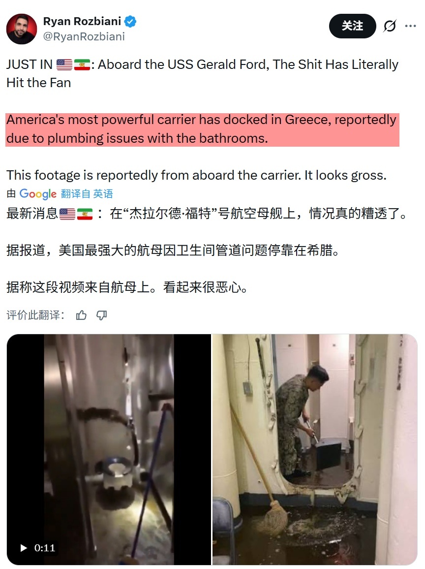 美伊冲突【打到成都吃大米!打垮伊朗去拉稀!】栽了栽了!谁也没有想到,在美国发动美伊战争前夕,成为福特号航母大型社死现场:美国海军最贵、最先进、130亿造的海上霸主竟然栽在了马桶上。——全舰650个马桶,近九成全线瘫痪,4600多名官兵上厕所要排队半小时,污水倒灌、屎尿横流,只能靠希腊给的150个移动厕所应急。不要小看粪水倒灌后勤事件,这很可能造成全舰疫病横行,造成严重的非战斗减员。