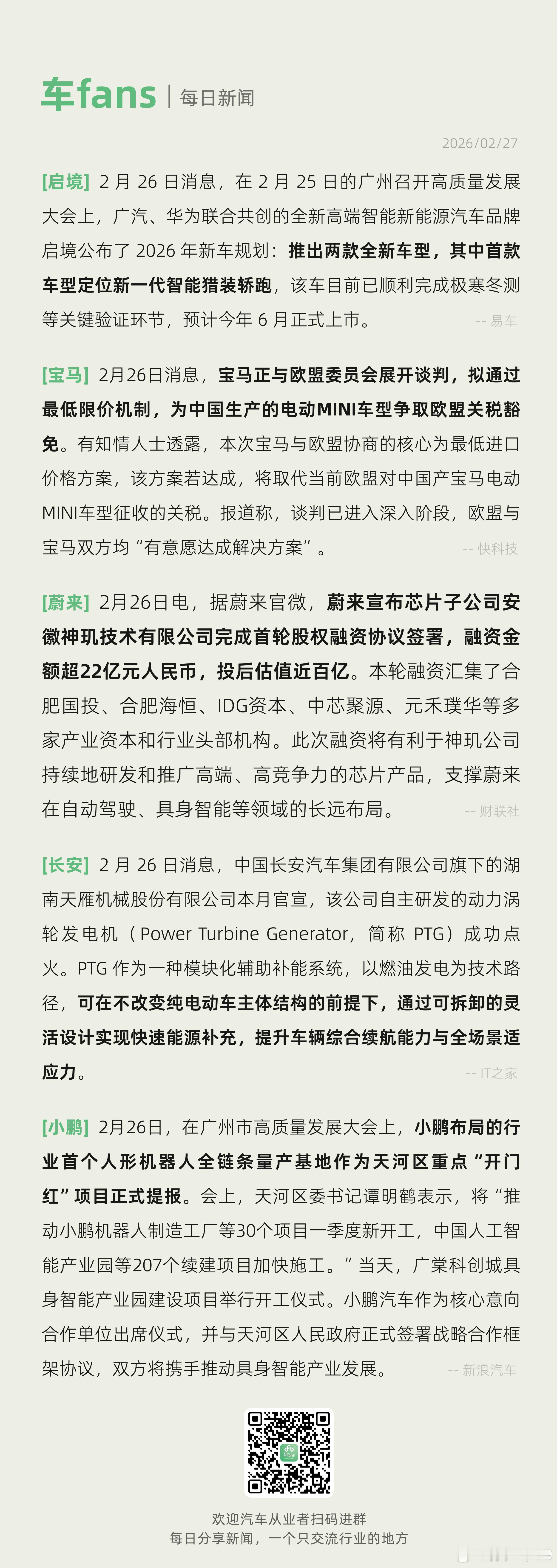 宝马为中国生产电动MINI争取欧盟关税豁免、小鹏人形机器人量产基地正式提报宝马正与欧盟委员会展开谈判,拟通过最低限价机制,为中国生产的电动MINI车型争取欧盟关税豁免。