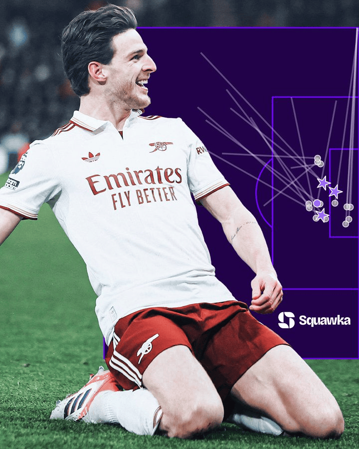 21次,赖斯是本赛季各项赛事创造绝佳机会最多的英超球员