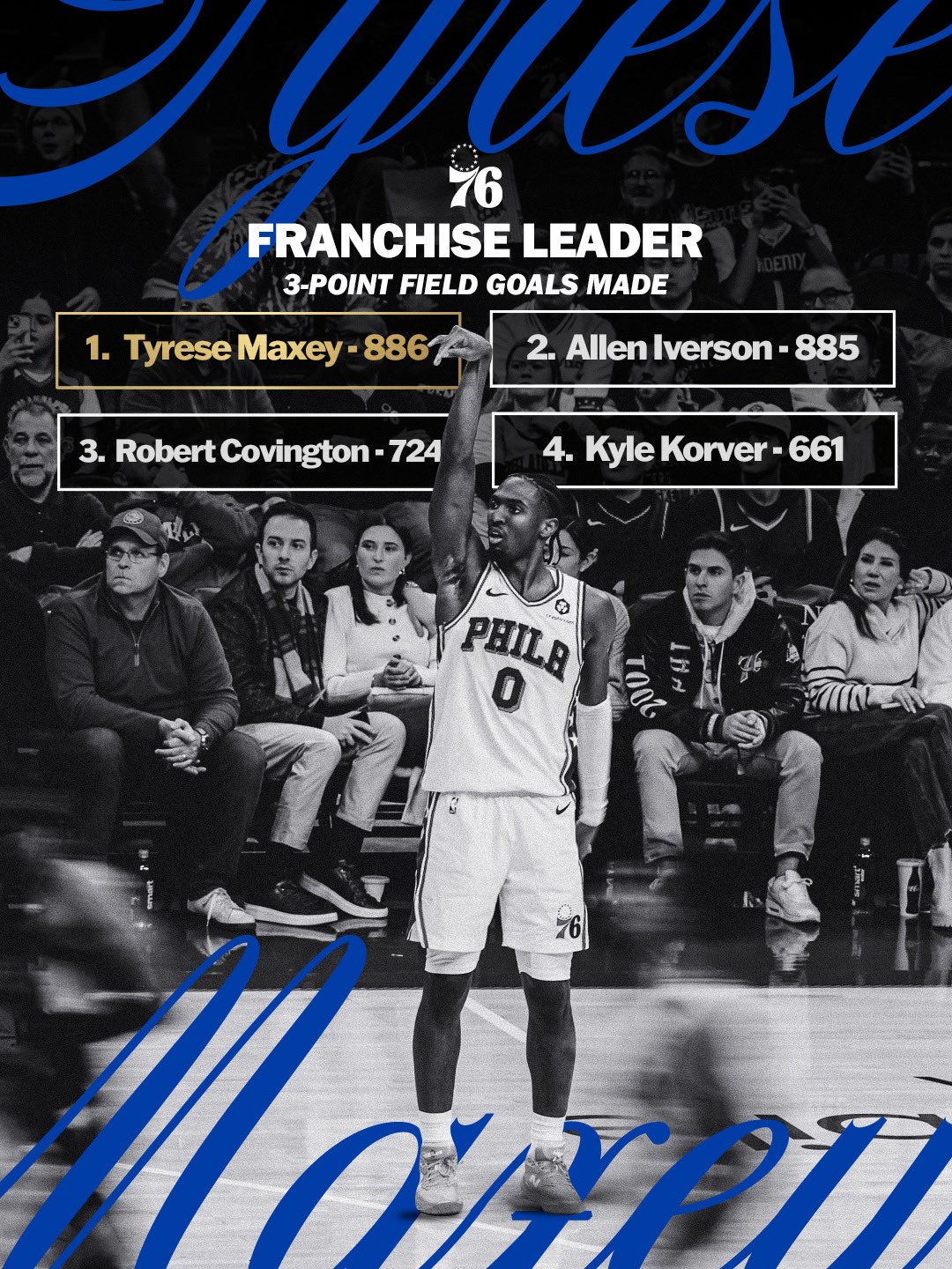 76人更新社媒:“历史性时刻,恭喜马克西现在是球队历史上三分球命中数最多的球员!”