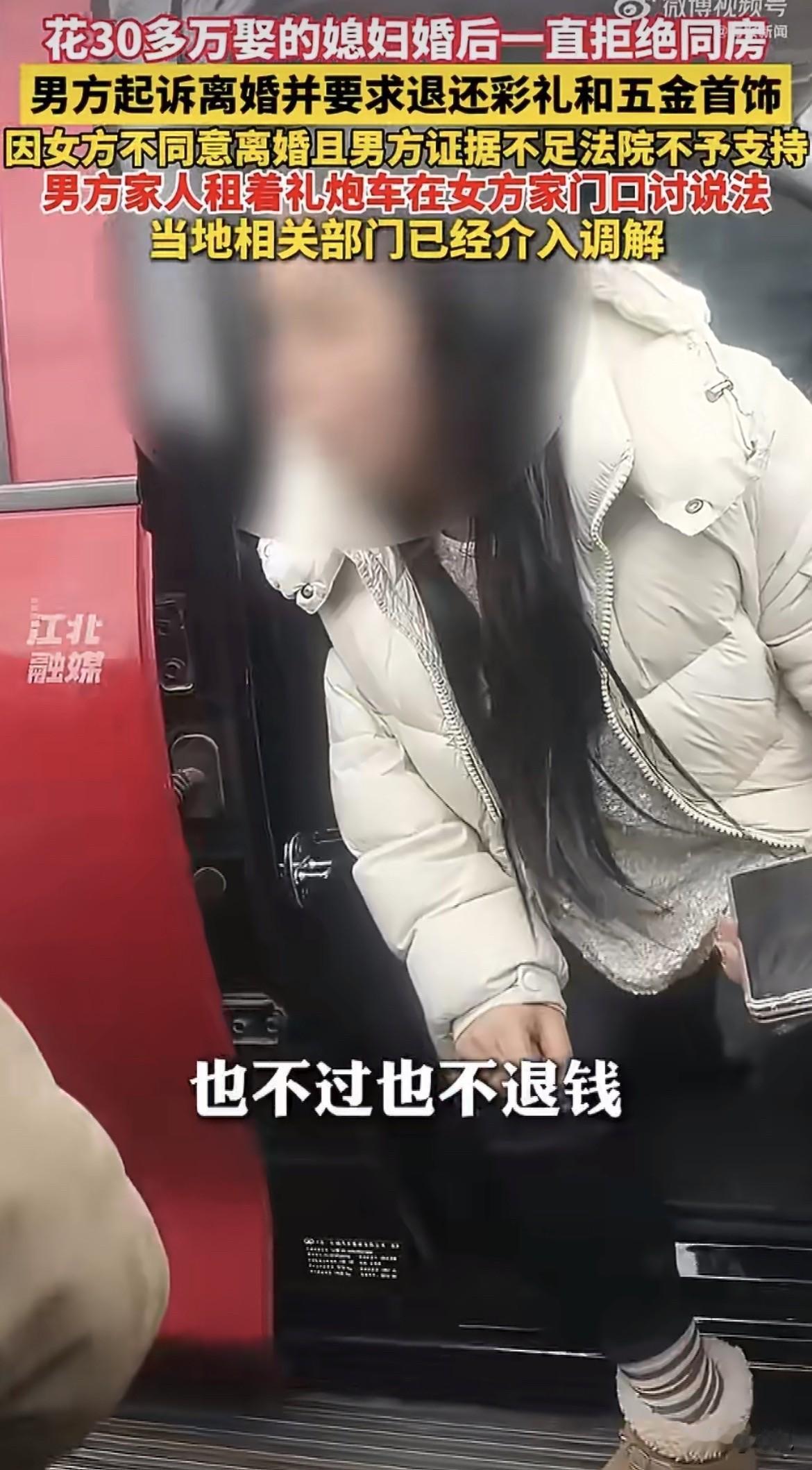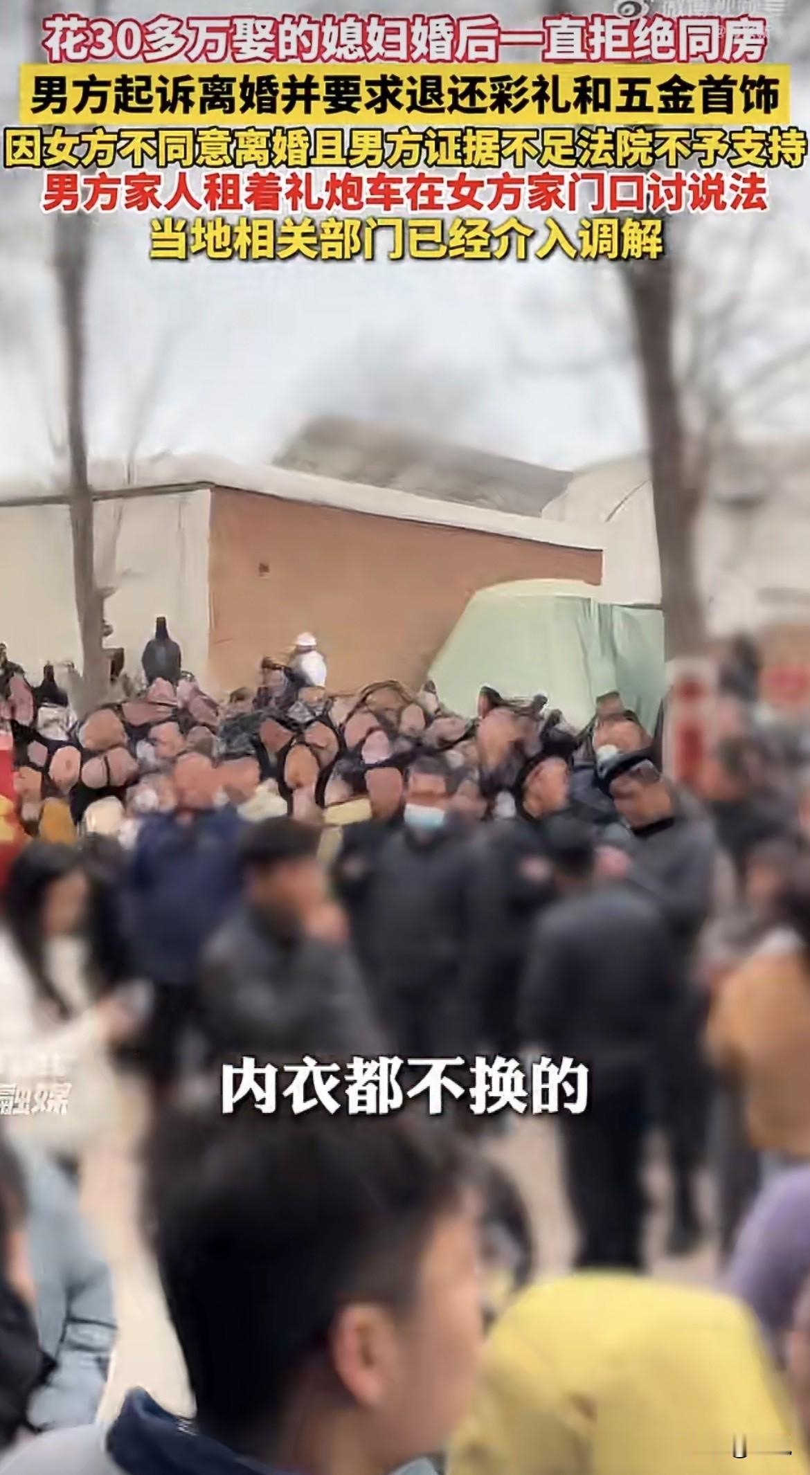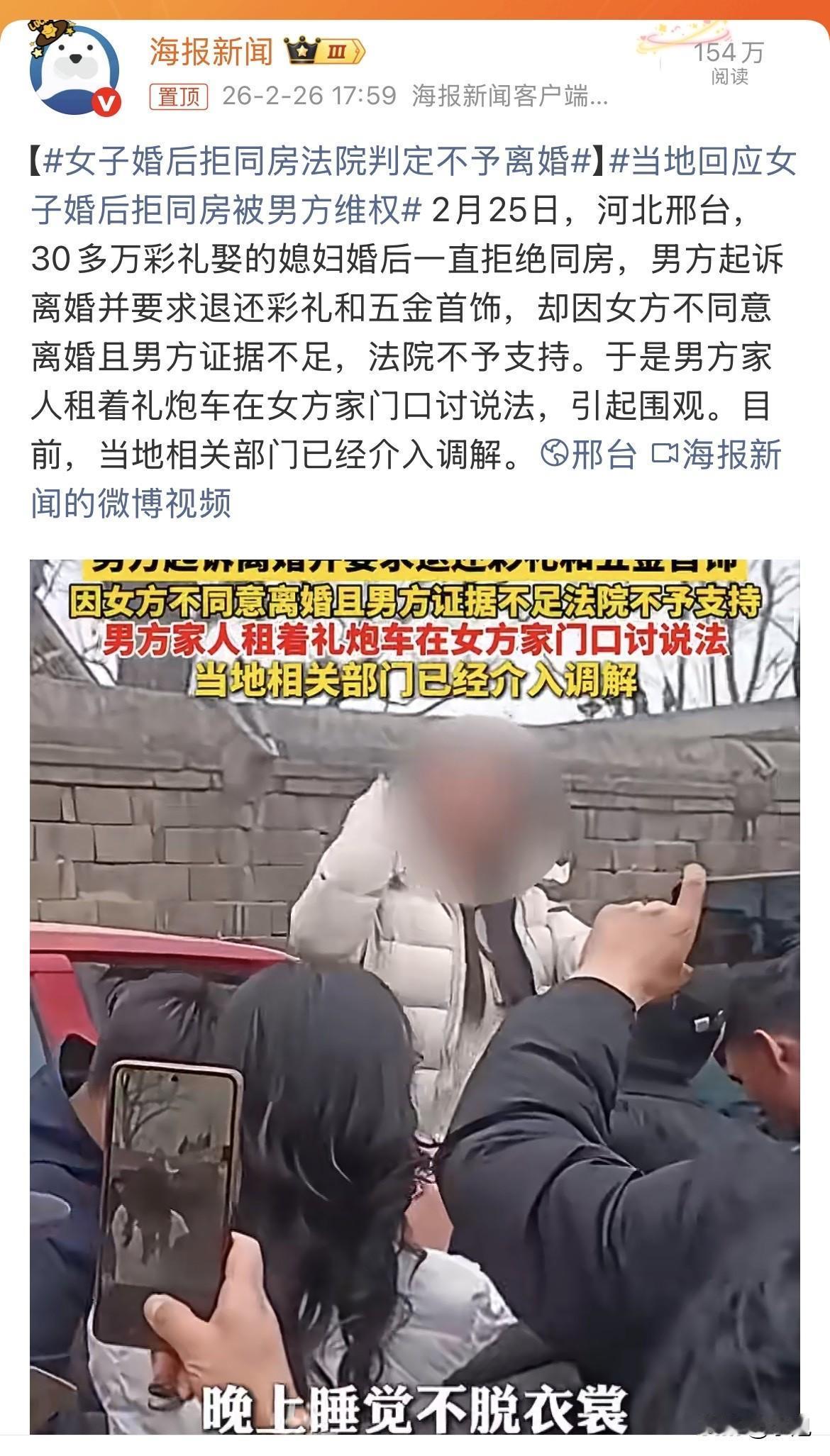 刷屏了,河北邢台,大正月里礼炮车不接亲,堵在人家媳妇娘家门口,不是放炮是开战。 男方堂姐站在车上,手里攥着法院判决书,拿着大喇叭对着墙头喊:弟媳妇结婚十个月不让碰,32万彩礼打水漂,大家给评评理。墙头上,女方家人拿着另一个喇叭对骂:你们一家子打人骂人,把我闺女打出精神病了还有脸来。两家隔着墙头对喷,唾沫星子横飞,看热闹的把村口路都堵死了。 男方姓高,32岁,退伍军人,邢台永福庄乡冯村的。女方姓李,26岁,同乡桥头村的。2023年经媒人介绍认识,媒人拍着胸脯说这闺女虽然是二婚,但绝对是个黄花大闺女。就冲这句话,高家把家底掏空了。 2024年2月9日领证,2月22日办婚礼。彩礼加五金加手机,总共花了32万多——这里面包括25万多彩礼、4万多五金、9400块手机。要是连摆酒席带其他零碎,男方说总共扔进去50多万。结婚那天,俩人看着还挺甜,新郎给新娘穿鞋、整理衣服,谁想到后面是这结果。 据男方姐姐讲,弟媳妇嫁过来,睡觉从来不脱衣服,男人一碰就嗷嗷叫上手挠人,男方身上挠得全是疤。这哪是两口子,简直是仇人。姑娘动不动跑回娘家,一住就是十天半个月,叫都叫不回来。男方说去接过好几次,每次去都带礼物,都快把村里小卖部搬空了。 熬了十个月,实在熬不下去了。2025年初,高先生一纸诉状告到法院,要求离婚退彩礼。 可到了法庭上,女方又是另一套说法。 人家说根本不存在拒绝同房这回事,婚后一直同住同床。她说高先生天天不上班,喝了酒就往死里折腾,月经期都不放过,把她折磨得不行。她说自己被多次打骂、拖拽、限制人身自由。2024年8月查出重度抑郁症,2025年5月还在邢台市第六医院住过院,诊断证明和住院票据都拿出来了。 女方还说,25万彩礼根本没收那么多,当地风俗一般就18.8万。婚后她买了电动车、家纺这些家庭用品,也花了钱,不存在骗彩礼的事。 法院一看这情况也犯难了。 男方说感情破裂要离婚,可证据呢?女方拿出了抑郁症诊断和住院票据,咬死了感情没破裂,就是不同意离。这种关起门来的事,谁能说清楚?最后法院判了:男方证据不足,不足以证明感情确已破裂,离婚请求不支持。既然婚不离,彩礼返还的基础条件自然不成立,一并驳回。诉讼费减半收了100块,男方掏。 判决下来,男方家炸了锅。 不服,绝对不服。2026年2月25日,男方堂姐开着那辆接亲用的礼炮车,拉着一家子人杀到女方娘家门口。电子炮震天响,把半个村子人都招来看热闹。堂姐站车上拿着喇叭喊:32万娶个媳妇,碰都不让碰,这钱是不是扔水里了? 女方家也不示弱,大门一关,当家的爬上墙头,拿着喇叭对着骂:你们一家没好人,把我闺女打出精神病了还倒打一耙!两家隔着墙头对喷,围观村民把路堵得水泄不通,据说村口都封路了。 男方索性在女方家门口支起大锅,杀猪做菜,招待来看热闹的乡亲。意思很明白,就是要让十里八乡的都看看,这家人是个什么情况。脸已经撕破了,这钱要是要不回来,这口气绝对咽不下去。 现在两边各说各的理,成了死疙瘩。 男方这边咬死了这就是骗婚——拿了钱不给过日子,天底下没这个理。女方那边反咬一口,说是家暴逼出了精神病,自己是受害者。最绝的是,女方既不回婆家过日子,也不同意离婚,就这么拖着。有网友分析,拖久了,结婚时间长了,彩礼就不好退了,到时候就能名正言顺占着。 可女方那边也有人撑腰,说人家有抑郁症住院记录,法院都没判离,凭啥说人家骗婚? 这事的焦点,说到底就在那32万彩礼上。钱在谁手里,谁就有主动权。当地相关部门已经介入调解了,可这种家务事,清官难断,外人怎么判? 有人说,女方既然说有家暴、有抑郁症,那为啥不赶紧离婚解脱,反而死活不离?这里头是不是有别的打算? 也有人说,男方不服判决可以上诉,跑到人家门口闹算怎么回事,这不是把自己从有理变没理了吗? 两边的说法都有人信,可真相到底在哪儿,只有关起门来的那两个人知道。 对于这事,你是信男方说的骗婚,还是信女方说的家暴?评论区等你来说道说道。