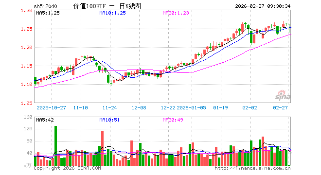 2月27日,价值100ETF(512040)开盘跌0.08%,报1.262元。价值100ETF(512040)重仓股方面,模塑科技开盘涨0.00%,亚翔集成跌1.77%,久立特材跌0.71%,云铝股份跌0.90%,伟隆股份涨0.24%,三七互娱涨0.00%,豫光金铅跌0.17%,亚普股份涨0.00%,厦门钨业涨0.00%,中国太保跌0.17%。