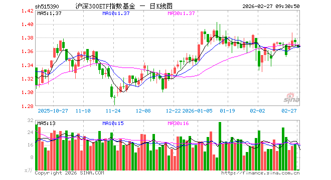 2月27日,沪深300ETF指数基金(515390)开盘跌0.29%,报1.369元。沪深300ETF指数基金(515390)重仓股方面,宁德时代开盘涨0.32%,贵州茅台涨0.05%,中国平安涨0.16%,中际旭创跌3.01%,紫金矿业跌0.43%,招商银行涨0.13%,新易盛跌3.86%,美的集团跌0.28%,兴业银行跌0.05%,长江电力涨0.04%。