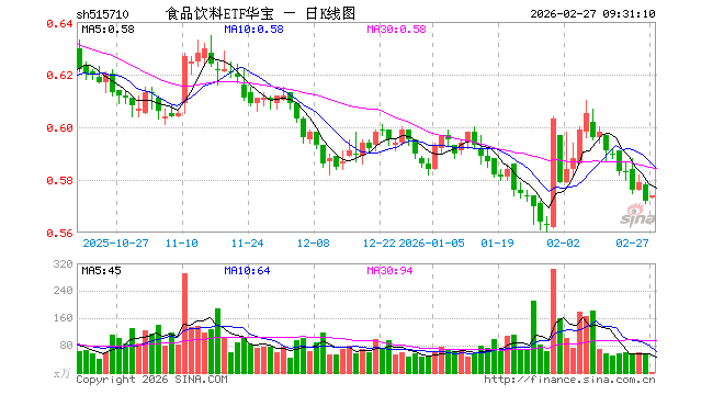 2月27日,食品饮料ETF华宝(515710)开盘涨0.17%,报0.573元。食品饮料ETF华宝(515710)重仓股方面,贵州茅台开盘涨0.05%,五粮液涨0.00%,伊利股份涨0.04%,泸州老窖涨0.04%,山西汾酒涨0.30%,海天味业涨0.39%,东鹏饮料跌1.48%,洋河股份跌0.06%,安琪酵母跌0.16%,今世缘跌0.03%。