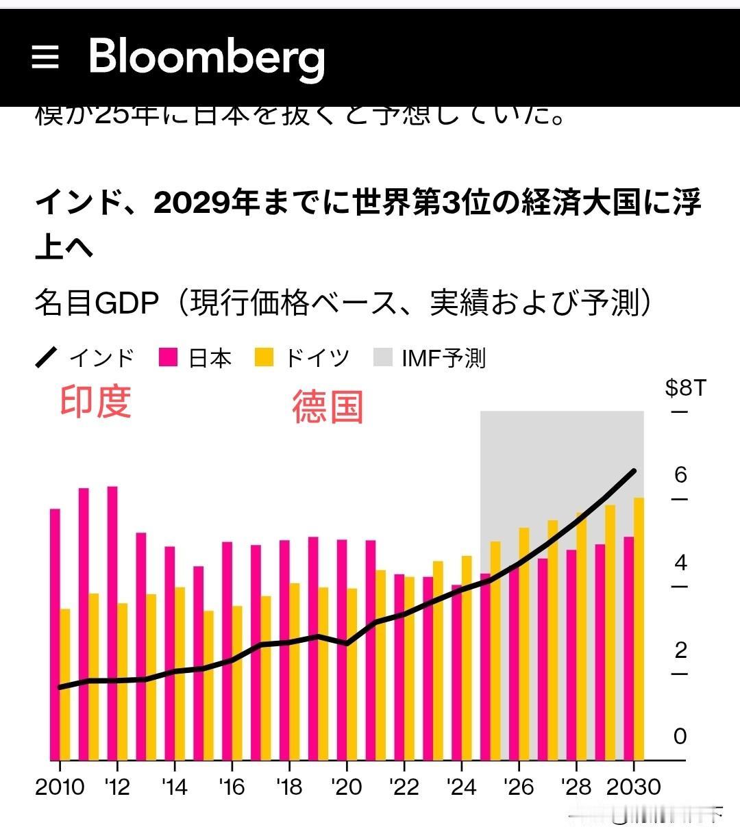 印度发展强势,日本排名继续下滑! 彭博社(Bloomberg)2月26日报道,印度将取代日本成为GDP世界第四大经济体。 印度多年以来一直是继美国,中国,德国,日本之后的第五大经济体。现在,由于GDP用美元评估,面对因日元贬值GDP缩水的日本,拥有大量青壮年人口的印度奋起直追,或将于本周内宣布GDP取代日本成为世界第四大经济体。 世界货币基金组织(IMF)曾预测印度将在2025年超过日本,但由于当年印度卢比兑美元汇率下降了5%未能成行。 文章指出,人口增长是经济快速增长的强大动力。1947年独立初期,印度人口是三亿6100万,现在这个数字是14亿,2021年人口年龄中间值是28岁。到2036年为止,约65%的人口年龄低于59岁。拥有强大劳动人口的印度必然会给国家带来强大动力和消费市场。这些恰恰是多年来苦于高龄少子的日本或缺的。 该报道还预测,印度在2030年或成为世界第三大经济体。 印度总理莫迪一直致力于让印度成为发展中国家领头人,并且期待在他们独立100年的2047年让印度成为发达国家。 对我们中国来说,各国此消彼长,他们的发展模式和经验教训都是我们可以参考学习警惕的。