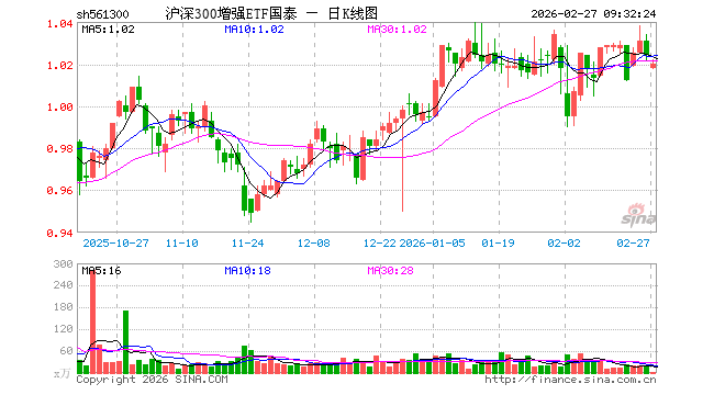 2月27日,沪深300增强ETF国泰(561300)开盘跌0.59%,报1.018元。沪深300增强ETF国泰(561300)重仓股方面,宁德时代开盘涨0.32%,贵州茅台涨0.05%,中国平安涨0.16%,招商银行涨0.13%,紫金矿业跌0.43%,中际旭创跌3.01%,美的集团跌0.28%,中信证券跌0.07%,恒瑞医药跌0.18%,国泰海通跌0.16%。