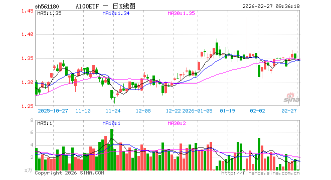 2月27日,A100ETF(561180)开盘跌0.30%,报1.344元。A100ETF(561180)重仓股方面,宁德时代开盘涨0.32%,贵州茅台涨0.05%,中国平安涨0.16%,中际旭创跌3.01%,紫金矿业跌0.43%,招商银行涨0.13%,美的集团跌0.28%,长江电力涨0.04%,东方财富跌0.18%,寒武纪跌2.03%。