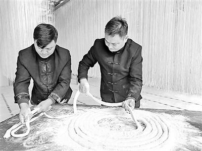 潢川空心贡面制作技艺省级非遗代表性传承人刘来旺(右)和儿子刘虹蕾在制作贡面。刘力娜摄