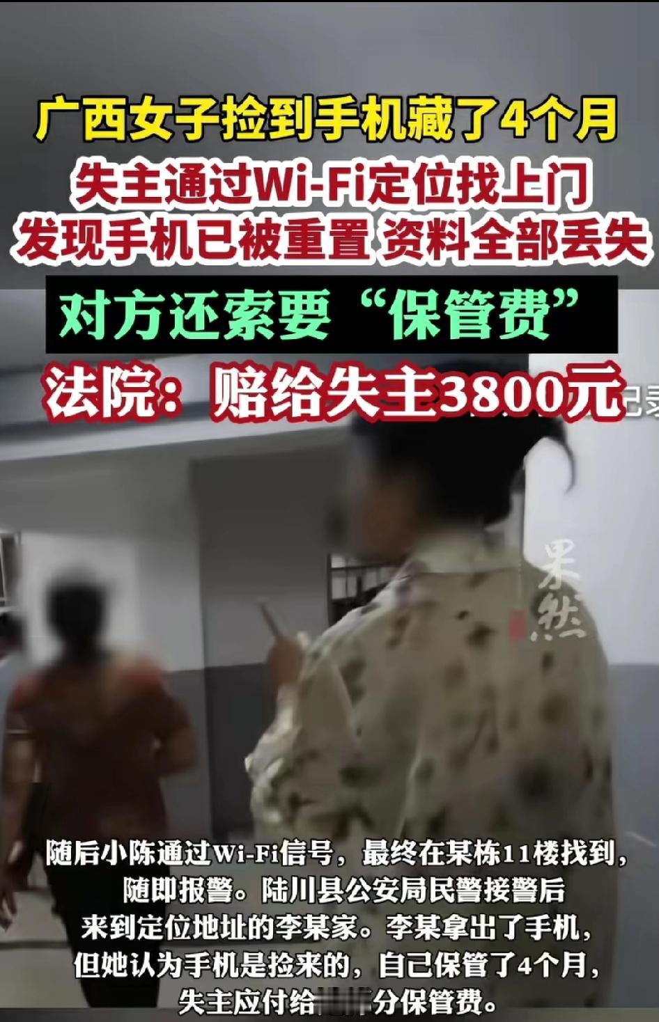 聪明反被聪明误!捡到价值6000多元的手机,不仅藏了4个月拒不归还,还强制恢复出厂设置清空所有资料,失主上门反而被索要保管费,法院一判太解气! 据媒体2026年2月26号报道: 广西陆川县,2025年3月16号晚上小陈在体育馆散步时,一部价值6000余元的华为手机不慎遗失。她反复拨打,电话那头始终是冰冷的关机提示。无奈之下,她启动“丢失模式”,在屏幕上留言:愿出2500元酬谢,只求手机归还。 可这一等,就是4个月。 捡到手机的李某,始终未主动联系。小陈的华为账号多次收到开机提示,却始终等不到一句主动联系。直到她通过Wi-Fi定位追到某小区,敲开李某家门时,才发现手机早已被强制恢复出厂设置,所有资料荡然无存。更让她心寒的是,李某不仅毫无歉意,反而理直气壮地索要“保管费”。 捡到东西不还,还反过来要钱?这操作,简直刷新三观。 协商无果后,小陈一纸诉状将李某告上法庭。2026年,广西陆川县人民法院审理并调解了此案。最终,李某当庭向小陈支付了3800元赔偿款,为自己的行为承担了相应的责任。 法律从来不会纵容这种“捡来就是我的”的歪理。拾得遗失物,有义务妥善保管并归还,而不是趁机要“保管费”。李某的行为,不仅违背了公序良俗,更触碰了法律的底线。 这件事也给所有人提了个醒:不义之财不可取,一时的贪念,最终只会让自己付出更大的代价。 你怎么看李某索要“保管费”的行为?如果是你,会选择归还还是据为己有? 拾金不昧 民生热点 法律维权 人性现实 晴风语说事 消息来源:齐鲁晚报-果然视频及网络公开内容,本文配图/视频素材来自齐鲁晚报-果然视频,以上仅用于内容分享,侵权即删,谢谢!