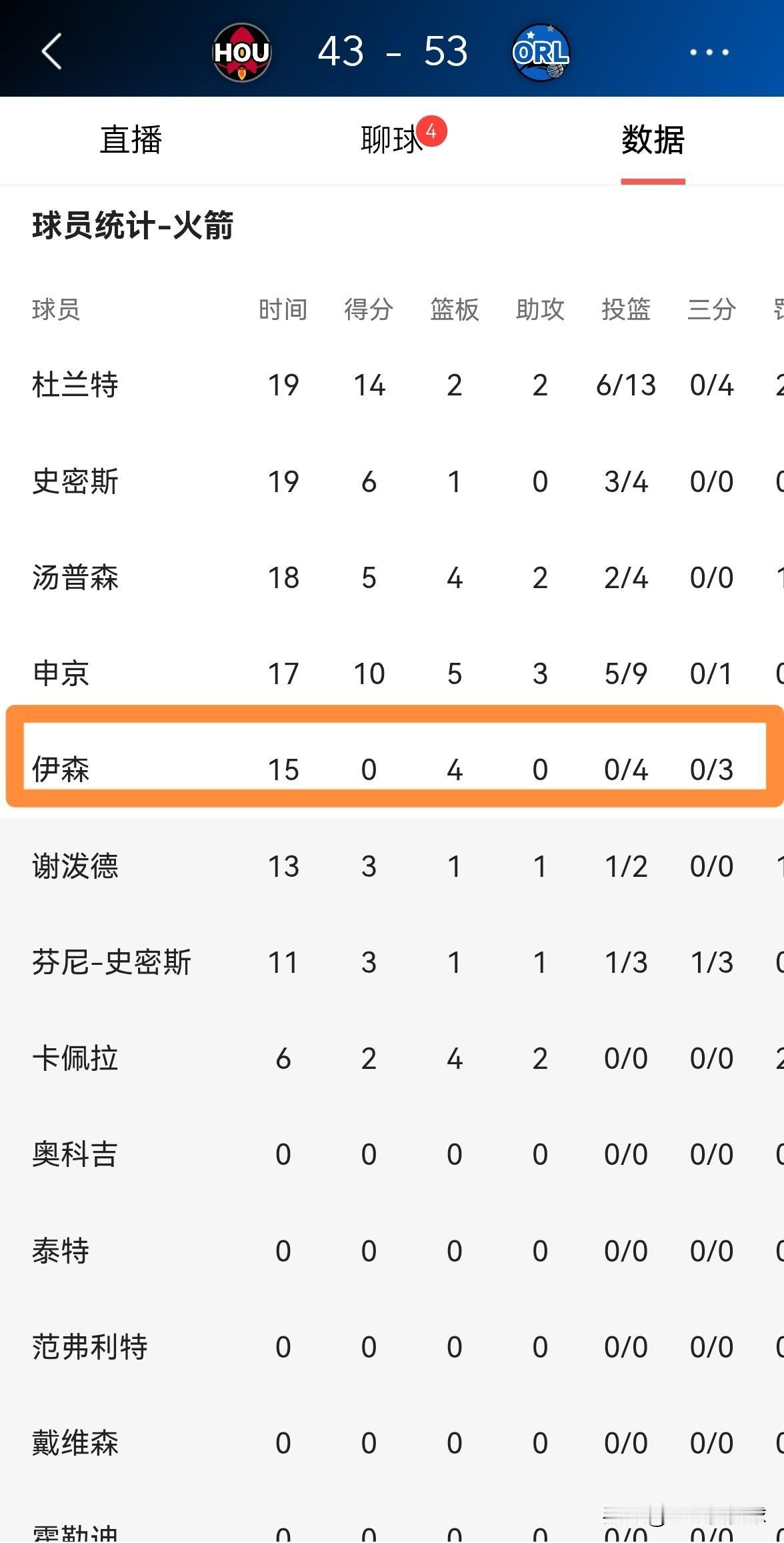 火箭大将伊森真是太拉胯了!在今天火箭客场挑战魔术的比赛中,目前双方半场战罢,火箭以43:53落后于对手。在前两节比赛中,伊森的表现极其的拉胯,他在首发出战的15分钟里,投篮4中0怒砍0分,还有3次失误。 老实说,如果火箭主帅乌度卡在下半场比赛中继续重用伊森的话,我相信火箭必败无疑,本场比赛伊森死活找不到进攻状态。
