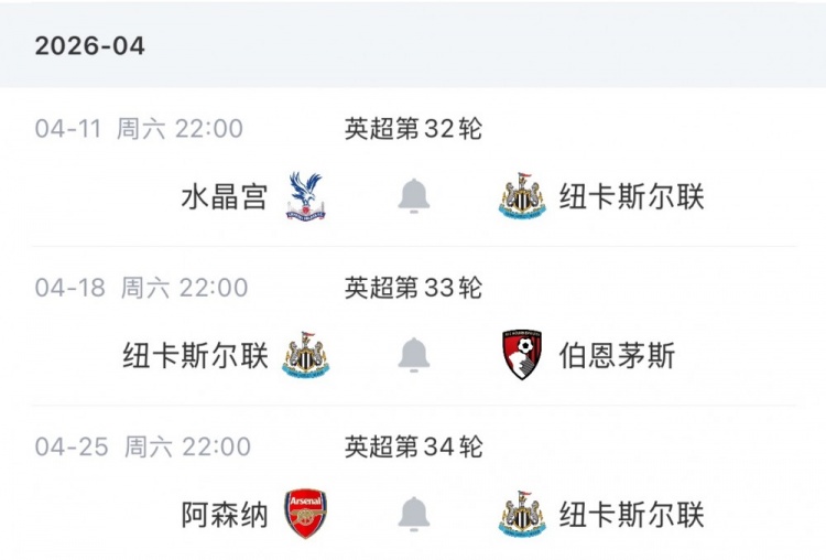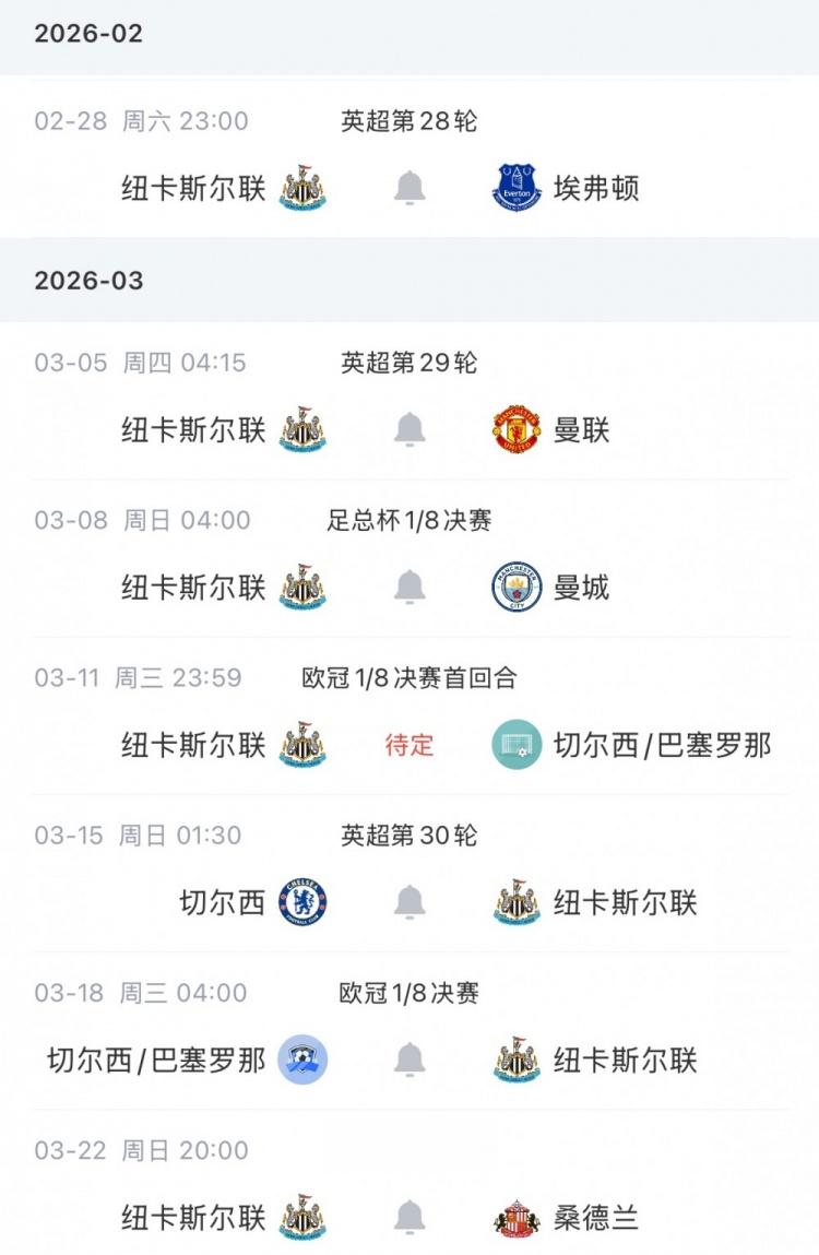 纽卡接下来的赛程如下