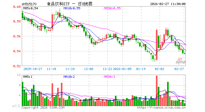 2月27日,截止午间收盘,食品饮料ETF(515170)跌0.19%,报0.536元,成交额4691.04万元。食品饮料ETF(515170)重仓股方面,贵州茅台截止午盘跌0.42%,五粮液涨0.36%,伊利股份涨0.38%,泸州老窖跌0.33%,山西汾酒涨0.07%,海天味业涨0.33%,东鹏饮料跌5.96%,洋河股份涨0.00%,安琪酵母涨3.19%,今世缘跌0.03%。