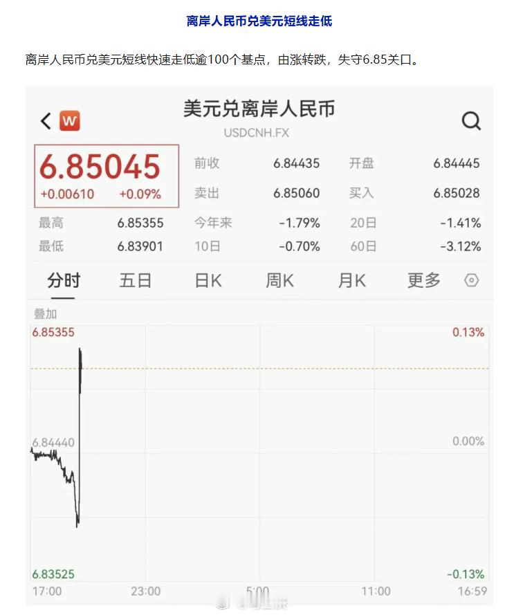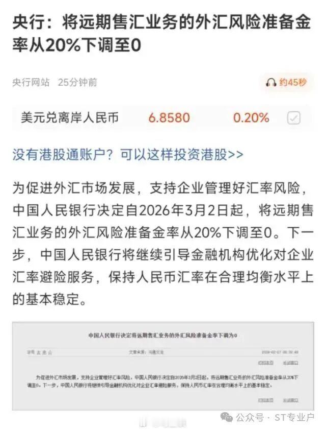 人民币持续升值创3年新高,央行发公告放大招,主稳汇率、降成本,一文看懂核心影响!央行近期重磅调整:自3月2日起,远期售汇外汇风险准备金率从20%直接降至0%。离岸人民币兑美元短线快速走低逾100个基点,由涨转跌,失守6.85关口。