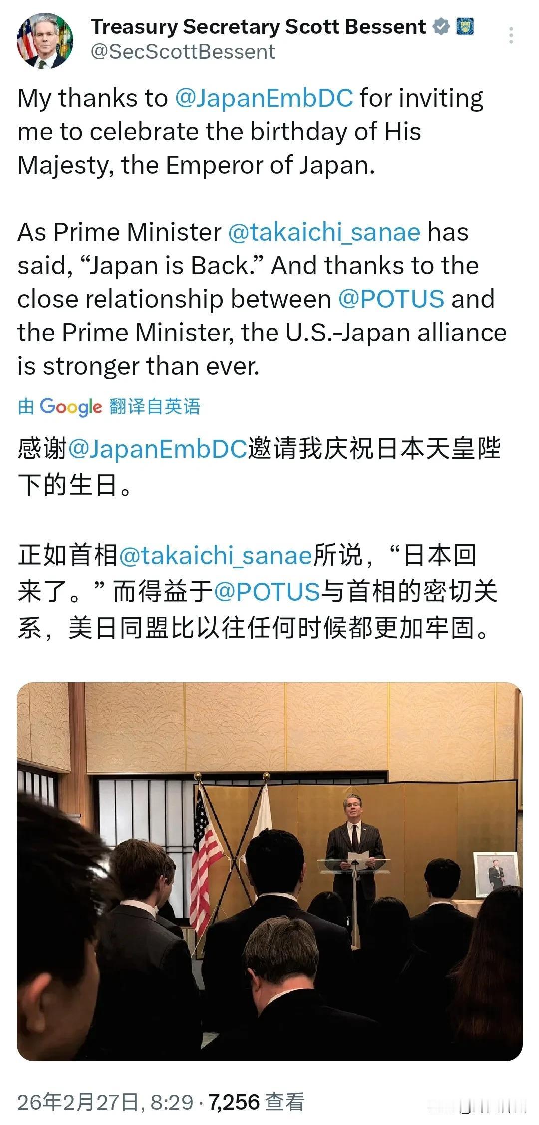 美国财长贝森特今天(北京时间2月27日)发文写道:“感谢日本驻华盛顿大使馆邀请我庆祝日本天皇陛下的生日。正如高市早苗首相所说,‘日本回来了。’而得益于特朗普总统与高市首相的密切关系,美日同盟比以往任何时候都更加牢固。” 评几句: 美国财长贝森特前脚还在对相关经济政策提出提醒,转眼就在外交场合高调表态,宣称美日同盟比以往任何时候都更加牢固。如此迅速的态度转变,尽显现实版的“前倨后恭”。 一场本该平和的交流活动,被刻意赋予了浓重的造势色彩,所谓的“牢固关系”更像是一场精心安排的对外展示。国家间的交往,本应建立在平等尊重、互利共赢的基础之上,而不是这般前后不一、按需切换的场面说辞。 这种忽软忽硬的姿态,看似灵活务实,实则充满功利性的权衡。嘴上强调亲密合作,行动上却根据自身利益随时调整姿态,这样的关系缺少真诚,也难以真正获得认可。 和平发展、合作共赢才是时代主流。靠表演与造势维系的关系,终究只是表面风光,经不起时间与现实的长期检验。